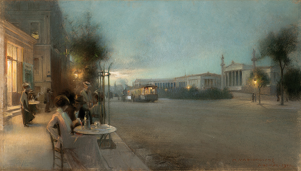Το ζαχαροπλαστείο του Πετρίτση, στέκι των Αθηναίων απέναντι από το Οφθαλμιατρείο και την Αθηναϊκή τριλογία, έβγαζε τραπεζάκια έξω στο πλακόστρωτο πεζοδρόμιο. Στο βάθος αριστερά διακρίνεται το γωνιακό μέγαρο Σερπιέρη. Η λεωφόρος Πανεπιστημίου, χωμάτινη ακόμα, φωτίζεται το σούρουπο από αναμμένους φανοστάτες. Στο βάθος το ατμήλατο τραμ με αφετηρία την Ακαδημία διασχίζει τη λεωφόρο με προορισμό τα Φάληρα.