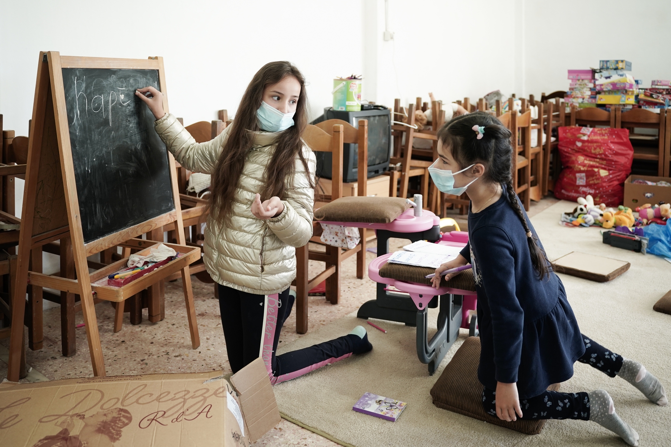 A young Ukrainian Refugee Girl is teaching the Greek language to another Refugee girl from Ukraine in their temporary residence at Rafina Summer, on April 13, 2022 / Εμα νεαρό κορίτσι από την Ουκρανία μαθαίνει ελληνικά σε ένα άλλο κορίτσι από την Ουκρανία, στο προσωρινό του κατάλυμα στις κατασκηνώσεις του Δήμου Ζωγράφου στην Ραφήνα, στις 13 Απριλίου 2022