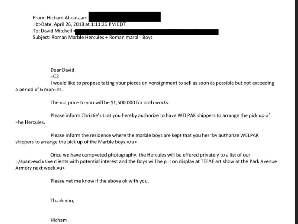 Ένα από τα μέιλ που ανταλλάσσει ο «αρχιερέας» της αρχαιοκαπηλίας, Χισάμ Αμπουτάμ με τον στενό συνέταιρο κι εκπρόσωπο του Έπστιν, Ντέιβιντ Μίτσελ.