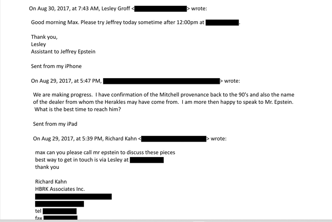 Είναι αρχαιοελληνικό το μαρμάρινο σύμπλεγμα των δύο μορφών-αγοριών; Ουδέποτε ξεκαθαρίζεται στην αλληλογραφία, μέσω email, με θέμα «Roman marble Hercules and the two–figure group», η οποία λαμβάνει χώρα μεταξύ του Καν, ο οποίος υπογράφει ως «Richard Kahn HBRK Associates Inc» -να σημειωθεί ότι δικαστικά αρχεία και οικονομικές εκθέσεις συνδέουν την εταιρεία με οικονομικούς λογαριασμούς που ανήκουν στον Έπστιν-, και του Μαξ Μπερνχάιμερ, του Διεθνούς επικεφαλής του τμήματος Αρχαιοτήτων στον οίκο δημοπρασιών Christie’s (από τις αρχές της δεκαετίας του 1990 έως το 2024).