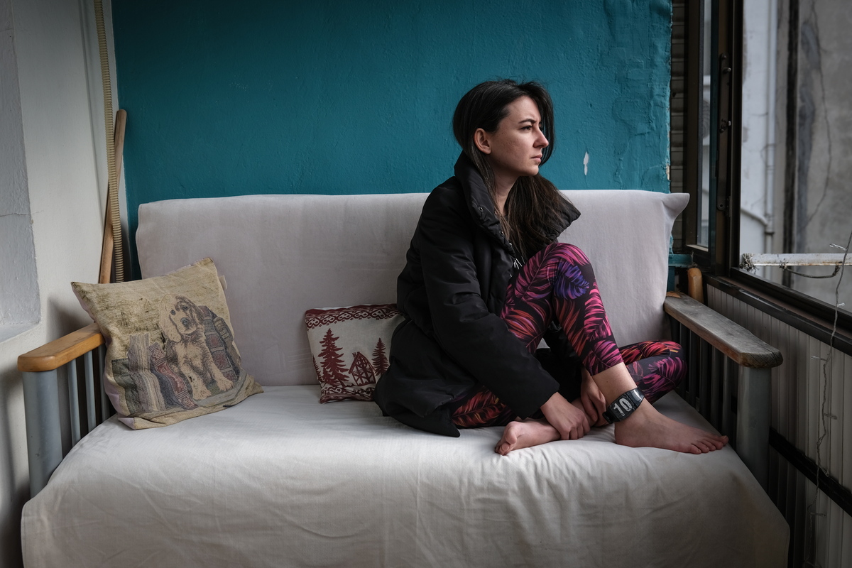 Η κλινική ψυχολόγος Melis Akyurek κάθεται στο μπαλκόνι της φορώντας το βραχιόλι ηλεκτρονικής επιτήρησης, κατά τη διάρκεια της κατ ‘οίκον σύλληψής της, αφού διαμαρτυρήθηκε για τη σύλληψη φοιτητών στην Κωνσταντινούπολη, Τουρκία, 13 Φεβρουαρίου 2021.