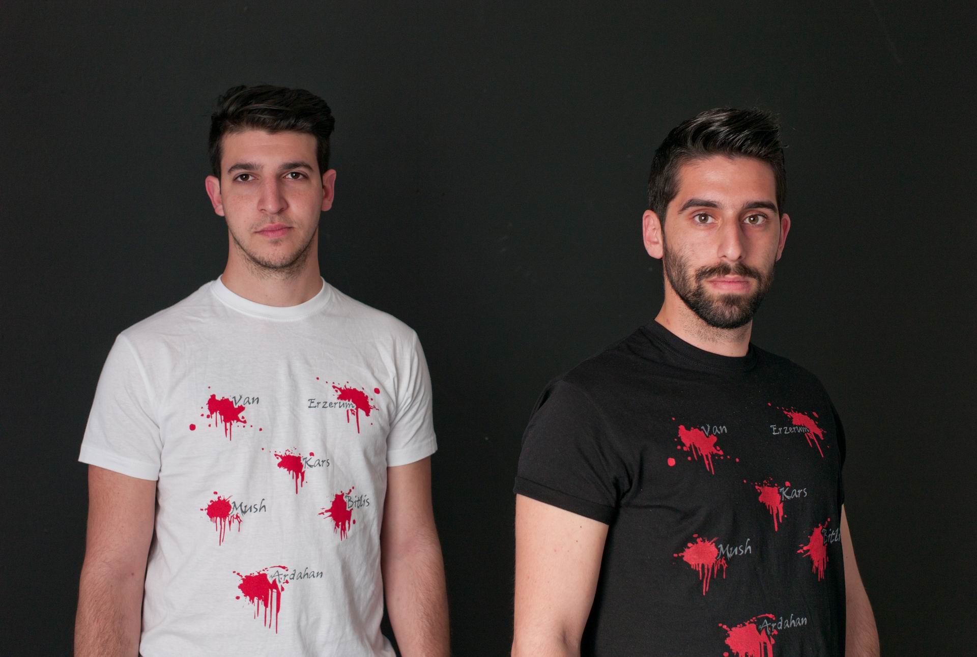Ο Ραζμίκ και ο Οννίκ φορούν μία μπλούζα της αρμένικης νεολαίας, στην οποία είναι γραμμένα τα ονόματα έξι αρμένικων πόλεων, που σήμερα βρίσκονται στην Τουρκία. «Είναι το Βαν, το Ερζερούμ, το Καρς, το Μους, το Μπιτλίς και το Αμπνταχάν», αναφέρει ο Ραζμίκ, δείχνοντάς με το χέρι του την κηλίδα αίματος που είναι ζωγραφισμένη δίπλα από κάθε πόλη. «Είναι οι έξι τόποι που διεκδικούμε εδαφικά και οι οποίοι υπέστησαν και τις μεγαλύτερες σφαγές στη γενοκτονία», προσθέτει ο ίδιος. «Η κηλίδα συμβολίζει το θάνατο και τις καταστροφές των πόλεων από την γενοκτονία». Στην πίσω πλευρά της μπλούζας τους είναι γραμμένη η φράση «Το αίμα των αθώων δεν στεγνώνει».