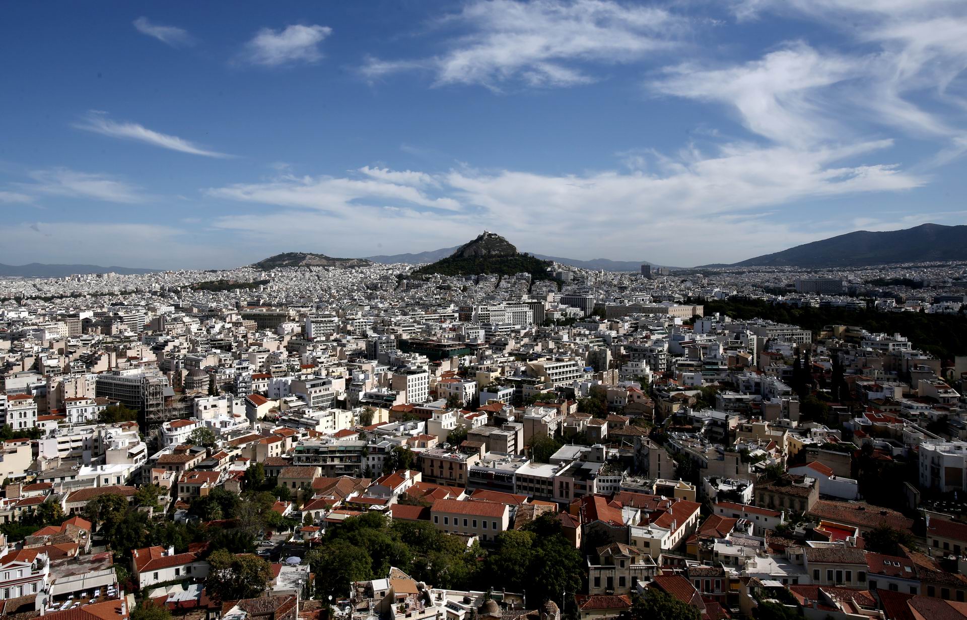 Πανοραμική θέα της Αθήνας από τον λόφο της Ακρόπολης. Ο λόφος του Λυκαβηττού ξεχωρίζει στο κέντρο. Κατά την διάρκεια της τελετής έπαρσης της σημαίας, για την επέτειο της Απελευθέρωσης της Αθήνας απο τα Γερμανικά στρατεύματα κατοχής. Δευτέρα 12 Οκτωβρίου 2015.