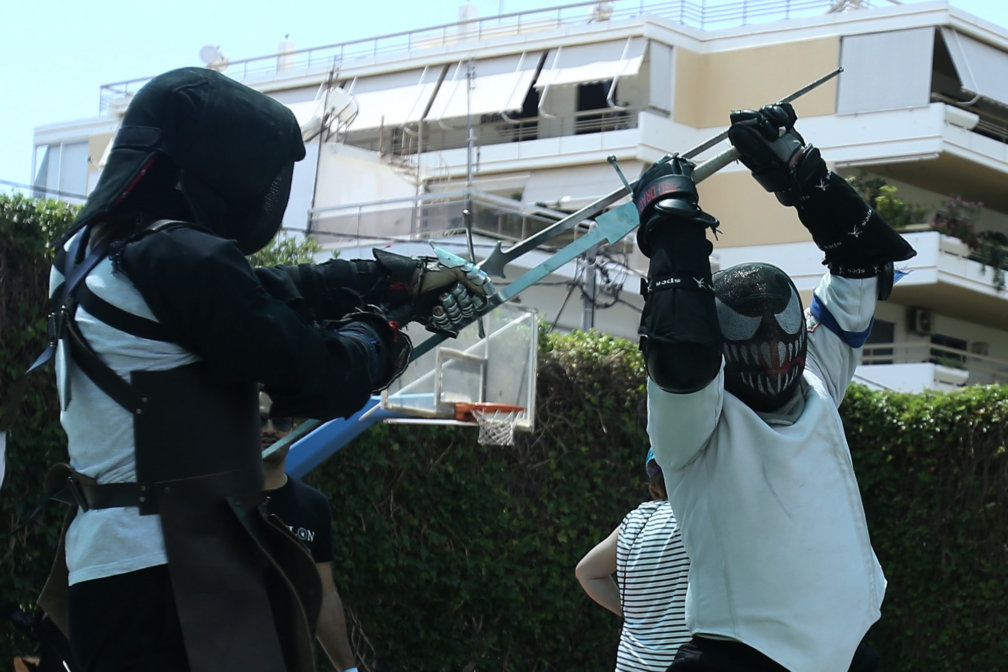Φτάνοντας στο αθλητικό κέντρο, ο ήχος από τις λάμες των σπαθιών που αντηχούσε στα πέριξ σ’ έκανε να αντιληφθείς ότι κάτι ιδιαίτερο συμβαίνει. Το βλέμμα πέφτει σε κάποιους τύπους που ο εξοπλισμός τους θυμίζει κάτι από μεσαιωνική ενδυμασία και στολή των ΜΑΤ. Στις δύο αρένες μονομαχούσαν δύο ζευγάρια, το ένα με ατσάλινα σπαθιά longswords (μεγάλα μακριά σπαθιά εποχής σταυροφοριών) και το άλλο επίσης με ατσάλινα σπαθιά rapier and dagger ( με «χούφτα», σαν αυτά που βλέπουμε στους τρεις σωματοφύλακες). Ο δυναμισμός των χτυπημάτων σε συνδυασμό με την αρμονία των κινήσεων έδινε την εντύπωση ότι οι αθλητές θα μπορούσε να είχαν ξεπηδήσει από ταινίες εποχής όπως ο Highlander ή ο Άρχοντας των Δαχτυλιδιών.