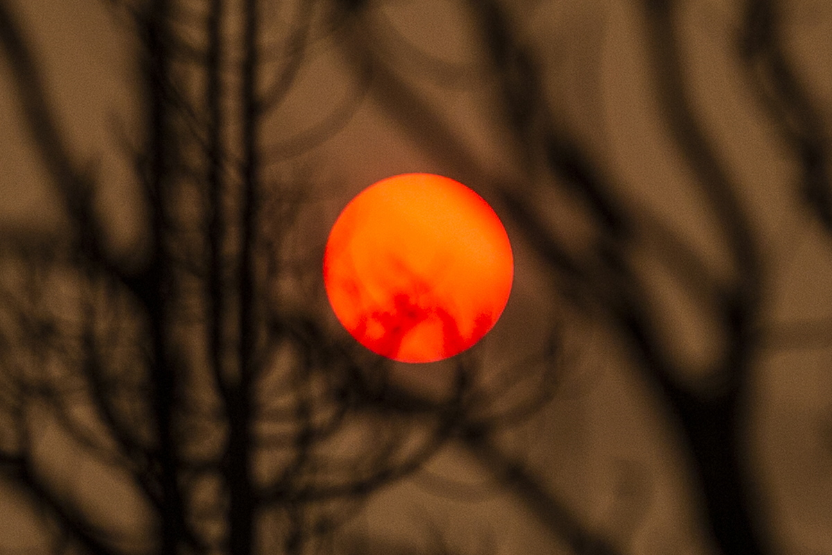 epa08655606 The sun shines red in the smoke of the Creek Fire near Shaver Lake, in the Sierra National Forest, California, USA, 08 September 2020. According to reports, the Creek Fire has burnt over 145,000 acres of forest. EPA/ETIENNE LAURENT