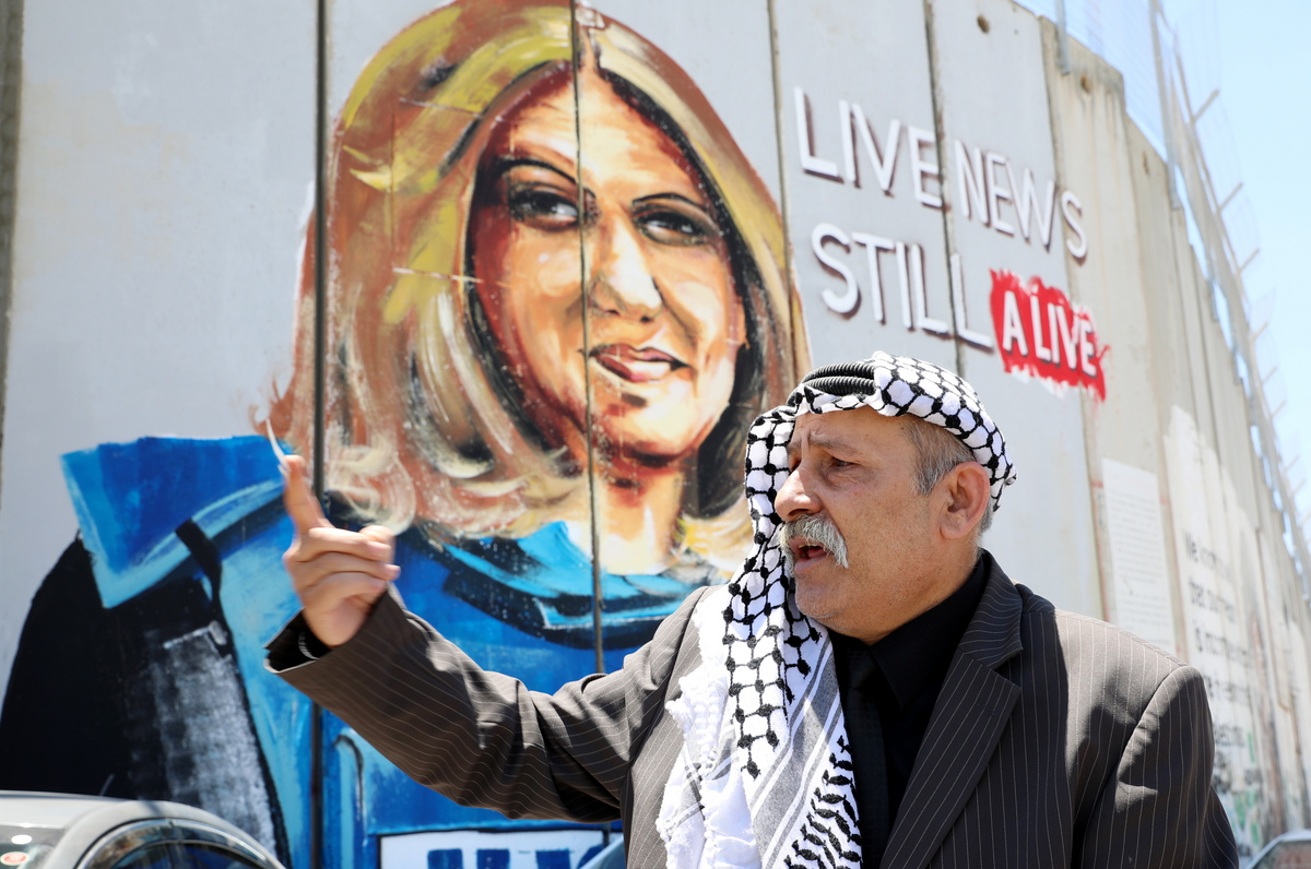 Τοιχογραφία της αείμνηστης Παλαιστίνιας δημοσιογράφου του δικτύου Al Jazeera Shireen Abu Aqleh στην παλαιστινιακή πλευρά του ισραηλινού διαχωριστικού τείχους, στην πόλη Βηθλεέμ της Δυτικής Όχθης.