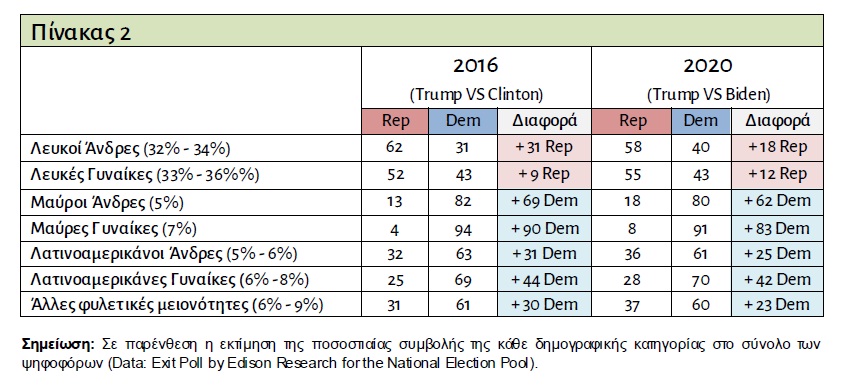 Μεταξύ της συγκεκριμένης δημογραφικής κατηγορίας, η διαφορά μειώθηκε δραστικά από περίπου 31% στις εκλογές του 2016 σε 18% κατά τις εκλογές του 2016 (βλ. Πίνακα 2), κυρίαρχα λόγω της μεταστροφής των λευκών ανδρών 45 – 50 ετών και άνω και δευτερευόντως των λευκών ανδρών έως – αυστηρά – 24 ετών. Μάλιστα σε ορισμένες κατηγορίες (πχ. λευκοί άνδρες 25 έως 44 ετών) ο Trump διατήρησε αναλλοίωτο το ευρύ προβάδισμα του έναντι των Δημοκρατικών ή σε ορισμένες άλλες (πχ. μαύροι και γενικότερα μη λευκοί αμερικάνοι) πέτυχε ακόμα και να μειώσει ελαφρώς την εις βάρος του διαφορά σε σχέση με το 2016.