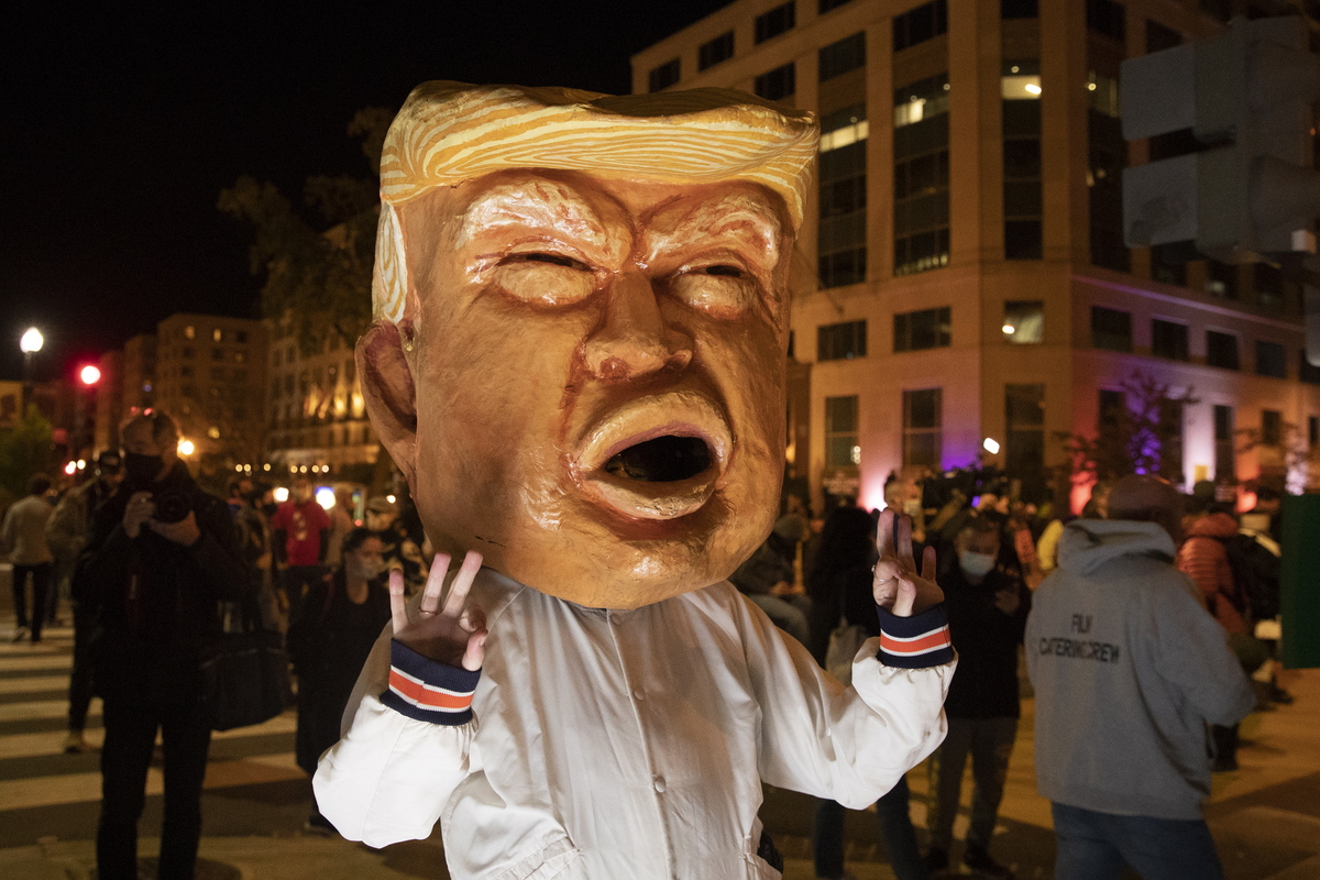 Μια γυναίκα φοράει μεγάλη μάσκα που απεικονίζει τον Πρόεδρο των ΗΠΑ Ντόναλντ Τραμπ, στην πλατεία Black Lives Matter το βράδυ των εκλογών, Ουάσιγκτον, DC, ΗΠΑ, 03 Νοεμβρίου 2020. EPA / MICHAEL REYNOLDS