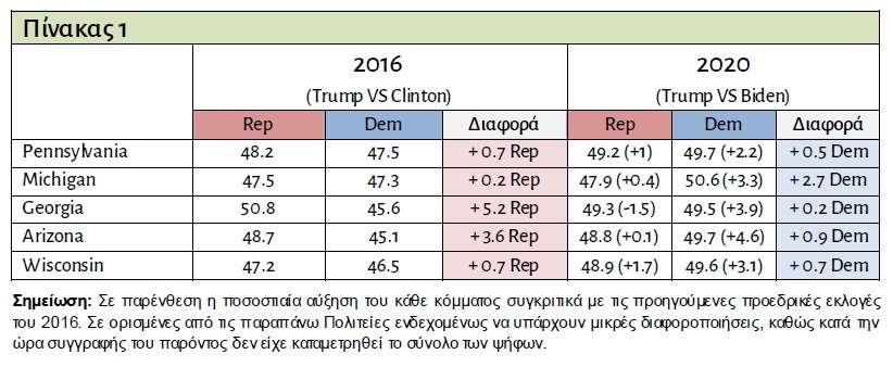Η μάχη για την προεδρία ήταν αμφίρροπη, καθώς στις λίγες κρίσιμες Πολιτείες (toss up) – αυτές δηλαδή για τις οποίες δεν γνωρίζαμε εκ των προτέρων αν θα στήριζαν πλειοψηφικά τον υποψήφιο των Δημοκρατικών ή των Ρεπουμπλικάνων – οι επιδόσεις του Trump ήταν καλύτερες του αναμενόμενου. Στη δημιουργία, δε, ενός κλίματος αβεβαιότητας ως προς την έκβαση του τελικού αποτελέσματος συνέβαλλε αποφασιστικά και το γεγονός πως, λόγω του μεγάλου όγκου επιστολικών ψήφων, η καταμέτρηση καθυστέρησε σε πολλές Πολιτείες, μεταξύ των οποίων και στις παραπάνω αμφίρροπες.