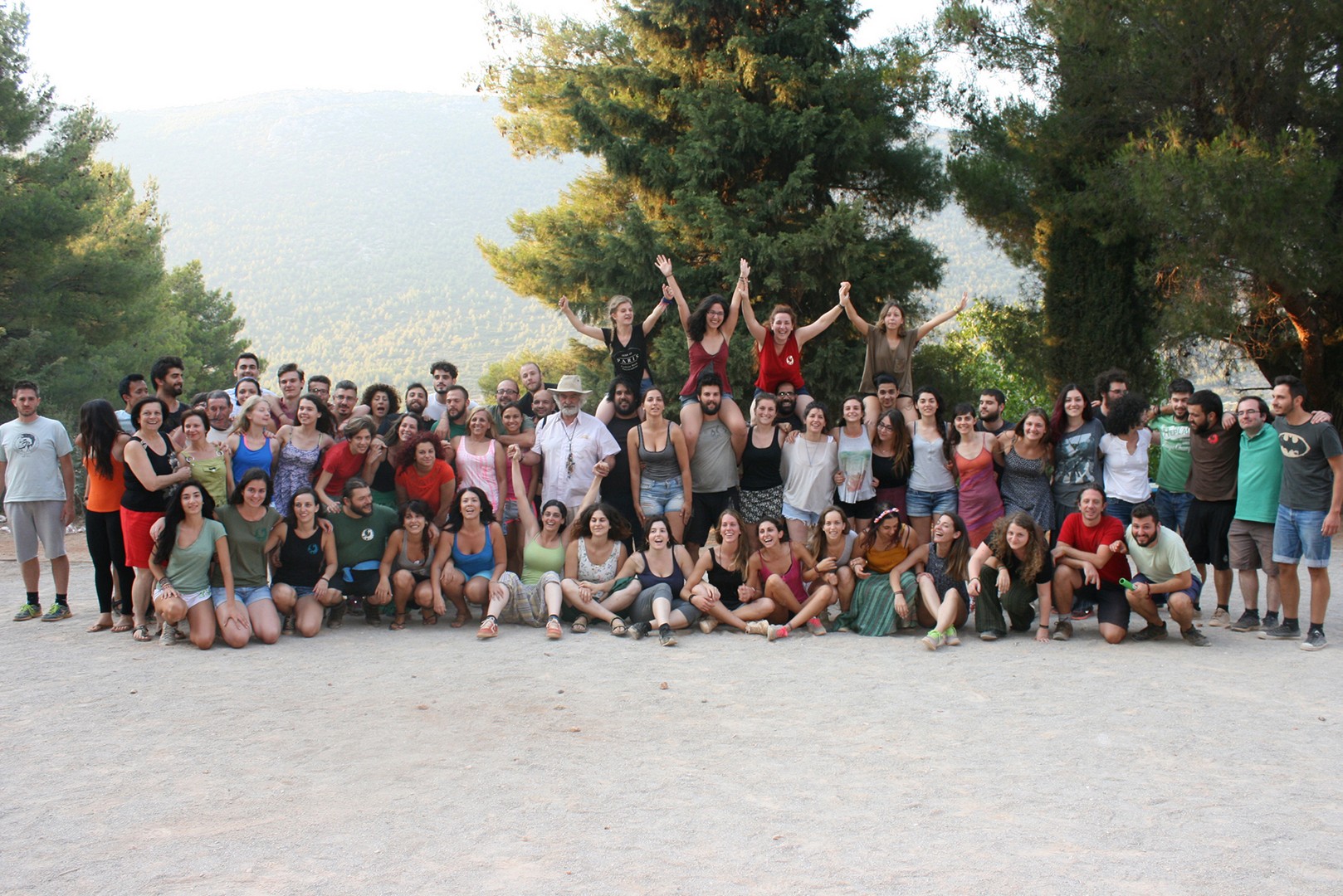 Στην πρώτη σειρά, αριστερά Μαρία Σπάτουλα, στη μέση Πέτρος Καλλίτσης, δεξιά Δημήτρης Αντωνίου στις εξέδρες του θεάτρου μαζί με άλλους εθελοντές της κατασκήνωσης.