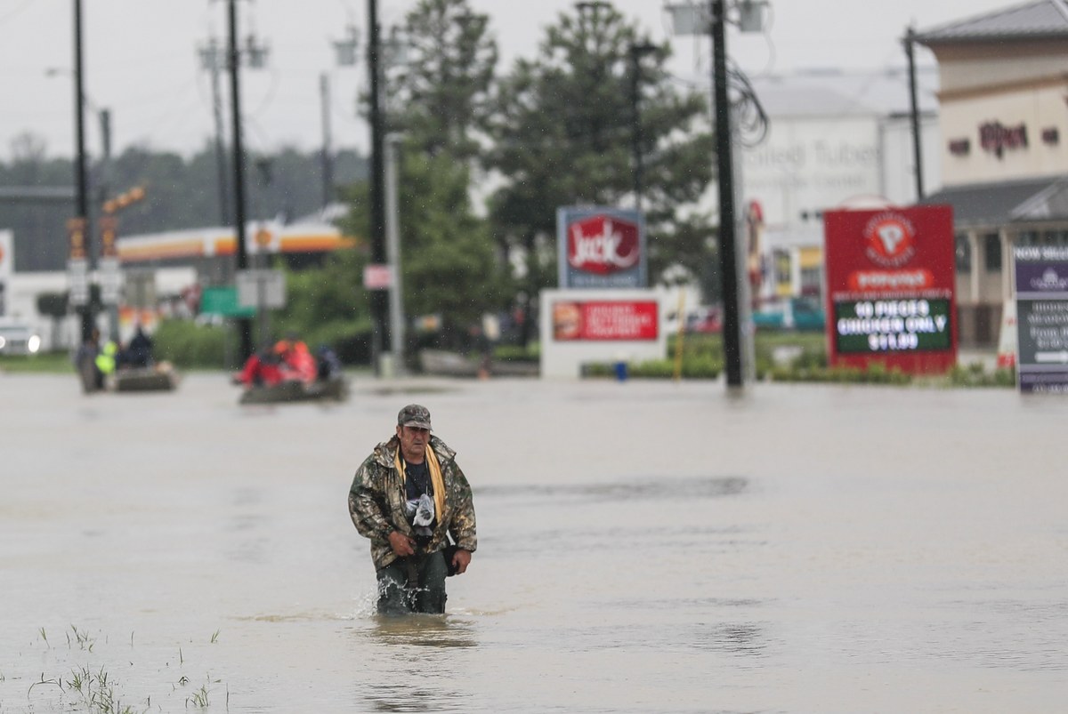 epa06170901 A man walks through floodwaters in the aftermath of Hurricane Harvey in Houston, Texas, USA, 29 August 2017. Hurricane Harvey made landfall on the south coast of Texas as a major hurricane category 4. The last time a major hurricane of this size hit the United States was in 2005. EPA/TANNEN MAURY