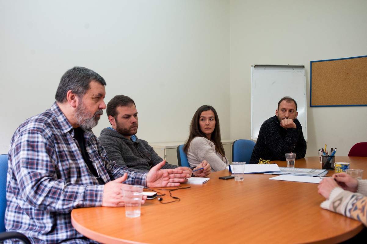 Από αριστερά, ο Δημήτρης Χονδρός -οικονομολόγος κοινωνικής ψυχιατρικής και διοικητικά υπεύθυνος του Κέντρου, ο Γιώργος Σκαλκώτος - κοινωνικός λειτουργός, η Βιβή Προκόπη - ψυχολόγος και ο Χρήστος Παπανδρέου - κοινωνικός λειτουργός.