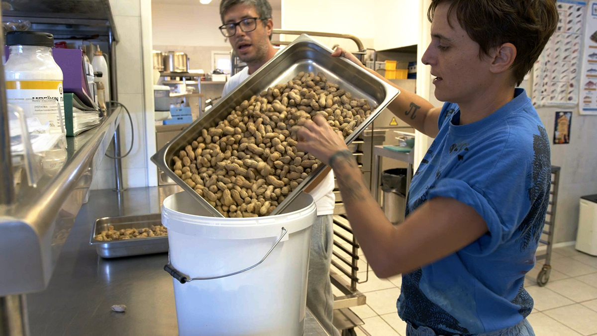Ένα στρέμμα έβγαλε περίπου 150 κιλά φιστίκια, το οποίο είναι ένα λογικό νούμερο γιατί οι έντονες βροχοπτώσεις του Αυγούστου επηρέασαν την παραγωγή. Τα 90 κιλά φιστικιού τα κάναμε βιοντίζελ και ουσιαστικά παρήγαγαν 26 λίτρα καύσιμου. Δεν είναι ιδιαίτερα κοστοβόρα διαδικασία η μετατροπή αυτή γιατί δεν χρειάζεται μονάδα να παραχθεί σε μικρές ποσότητες. Χρειάζεται σκεύη και αντιδραστήρες και αυτό που προσθέτεις είναι καυστική ποτάσα με την οποία φτιάχνουμε σαπούνια και μία μικρή ποσότητα μεθανόλης. Φτιάξαμε το βιοντίζελ στο Δημοκρίτειο Πανεπιστήμιο Θράκης. Θέλαμε όλη η ενέργεια που θα χρειαζόταν το Film Seed Festival για τις προβολές να έχει παραχθεί με βιώσιμο τρόπο. Γενικά για να είσαι πραγματικά sustainable και να τηρείς τις αρχές της βιωσιμότητας, η άποψη είναι ότι οι πολλές διαφορετικές πηγές είναι το καλύτερο» μας εξηγεί η Πάολα.