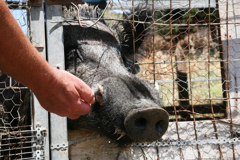 «Ελάτε να σας γνωρίσω τον Οβελίξ», μας λέει ο και μας οδηγεί σε έναν χώρο που βρίσκεται ένα αγριογούρουνο πολύ αγαπησιάρικο και χαδιάρικο όπως διαπιστώνω με έκπληξη, καθώς βλέπω ότι χώνει την κάπως θηριώδη αλλά ταυτοχρόνως γλυκιά μούρη του μέσα στην παλάμη του κυρίου Γιάννη και κλείνει τα μάτια του καθώς εκείνος το χαϊδεύει. «Ο Οβελίξ ήρθε στο Κέντρο όταν ήταν μόλις 8 μηνών, κάποιοι κυνηγοί είχαν σκοτώσει τη μάνα του και βρέθηκε μόνος και απροστάτευτος. Τώρα πια είναι 8 χρονών και για μένα είναι άνθρωπος. Συχνά ανοίγω την πόρτα για να τον αφήσω να κάνει τις βόλτες του. Να τον αφήσω ελεύθερο;» μας ρωτά αλλά με την Άσπα, δεν είμαστε και τόσο θετικές. Δεν είναι ότι φοβάμαι το ζώο, είναι ολοφάνερο ότι δεν είναι επιθετικό αλλά είμαστε κορίτσια της πόλης, σε καμία περίπτωση τόσο εξοικειωμένες με ένα, έστω και αξιογάπητο αγριογούρουνο, την έντονη μυρωδιά που αποπνέει και το τρίχωμά του που μένει στη χούφτα του κυρ-Γιάννη, γιατί όπως μας εξηγεί είναι η περίοδος που βγάζει το χειμωνιάτικο πουλόβερ για να μείνει με το καλοκαιρινό μπλουζάκι. Κι ενώ ακόμη ο Οβελίξ απολαμβάνει τα χάδια του φίλου του ένα όμορφο, κατάξανθο κορίτσι με ροζ τιραντάκι και σορτσάκι μας πλησιάζει χαρούμενο κρατώντας μια φωτογραφική μηχανή. Είναι η Τάνια από τη Ρωσία, έχει έρθει να βοηθήσει ως εθελόντρια το πάρκο, ο κύρ-Γιάννης της προσφέρει μια χούφτα αγριογουρουνότριχες και εκείνη τις μυρίζει σαν να πρόκειται για ένα μπουκέτο ολόδροσα τριαντάφυλλα, αναστενάζει κιόλας και εκείνη τη στιγμή νιώθω ότι το κόκκινο φωτάκι του περιβαλλοντικού σουρεαλισμού χτυπάει τιλτ.