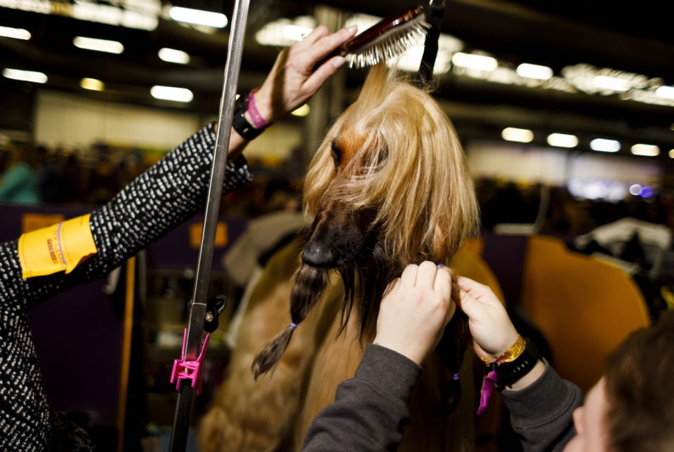 Ένα Standard Poodle δέχεται την περιποίηση του ειδικού. Westminster Kennel Club Dog Show, Νέα Υόρκη, ΗΠΑ, 11 Φεβρουαρίου 2019.