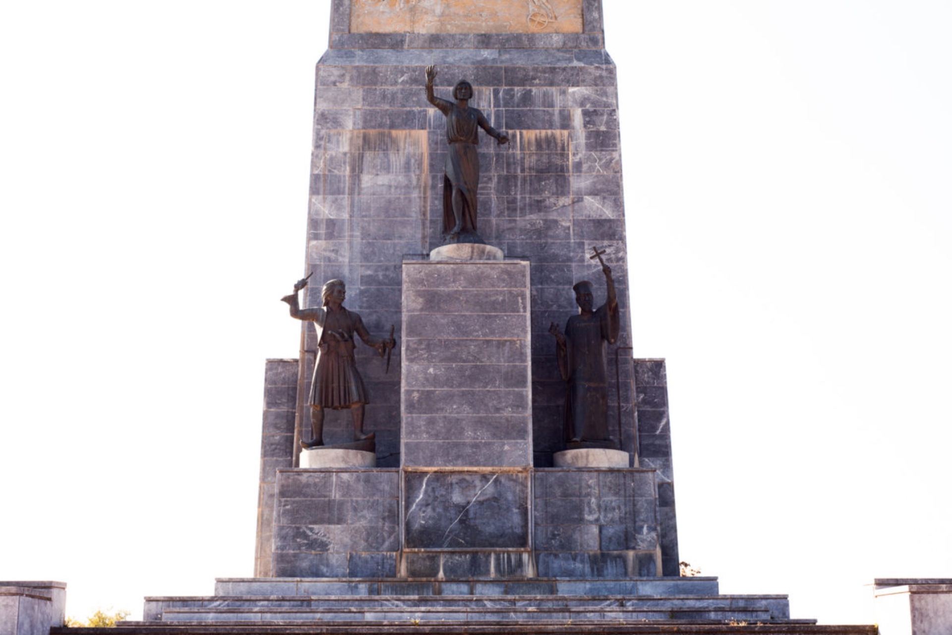 Η μαρμάρινη στήλη με ύψος δεκατεσσάρων μέτρων, από την βόρεια πλευρά του μνημείου. Αγία Λαύρα, Καλάβρυτα.