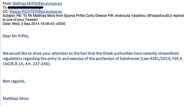 Μάλιστα κατάλαβα ότι εξυπηρετούσαν και τα συμφέροντα από διάφορες συντεχνίες, όπως π.χ. Σύλλογος Κουρέων Κομμωτών. Όπως θα δείτε στο email του Matthias Mors, με ενημερώνει ότι ψηφίστηκε στην Ελληνική Βουλή τον Αύγουστο, νέος νόμος, και υπάρχουν αλλαγές για την άδεια και ίδρυση καταστήματος υγειονομικού ενδιαφέροντος, όπως είναι τα κουρεία-κομμωτήρια. Παρόλα αυτά είμαι πολύ δύσπιστος και προσεκτικός το ότι αυτό το Ελληνικό κράτος με αυτό το παλιό δημοσιουπαλληλικό σύστημα,θα έχει καταφέρει οριστικά να δώσει λύση. Μη ξεχνάτε ότι από το 2011 έχουν ανακοινώσει ψεύτικα, ότι έχουν ανοίξει το συγκεκριμένο επάγγελμα δύο φορές! Για να δούμε! Θα είναι η τρίτη και φαρμακερή! Εντωμεταξύ νέα δημοσιεύματα αναφέρουν νέο σίριαλ, με αντικείμενο την απελευθέρωση των κλειστών επαγγελμάτων, ετοιμάζει η κυβέρνηση στο πλαίσιο των μνημονιακών της υποχρεώσεων. Η Τρόικα και το ΔΝΤ πιέζουν για ευρύτερες αλλαγές, υποστηρίζοντας ότι τέσσερα χρόνια μετά το άνοιγμα του «κεφαλαίου» των κλειστών επαγγελμάτων, δεν υπάρχει πραγματική άρση των εμποδίων. Το υπουργείο Οικονομικών υπό την πίεση της τρόικας προχωρά στη σύσταση τετράμελούς επιτροπής η οποία θα αναλάβει να καταγράψει τα επαγγέλματα, ποια από αυτά απελευθερώθηκαν, και πια δεν άνοιξαν, και αν υπάρχουν ακόμα εμπόδια, και να υποβάλει προτάσεις για την άρση τους. Άλλες διαδικασίες πάλι, καθυστερήσεις στην καθυστέρηση, επιτροπές,