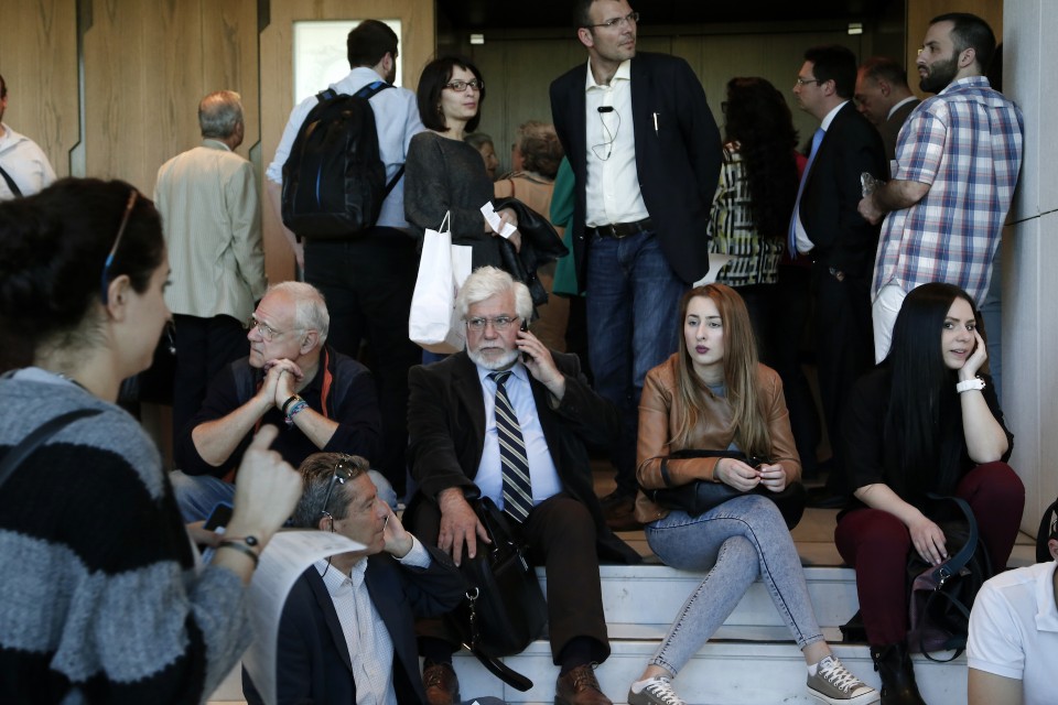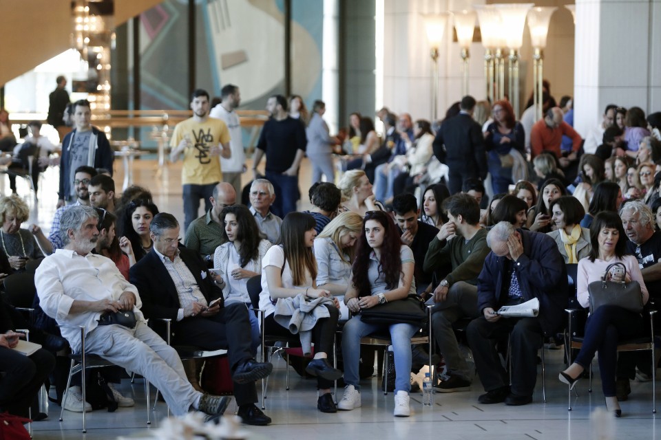 Πολυκοσμία κι εκτός αίθουσας που ήταν στημένη η γιγαντοοθόνη για όσους δεν εξασφάλισαν “μαγικό χαρτάκι” (ποτέ δεν πιστεύαμε ότι θα χρησιμοποιούσαμε αυτή τη φράση για διάλεξη οικονομολόγου)