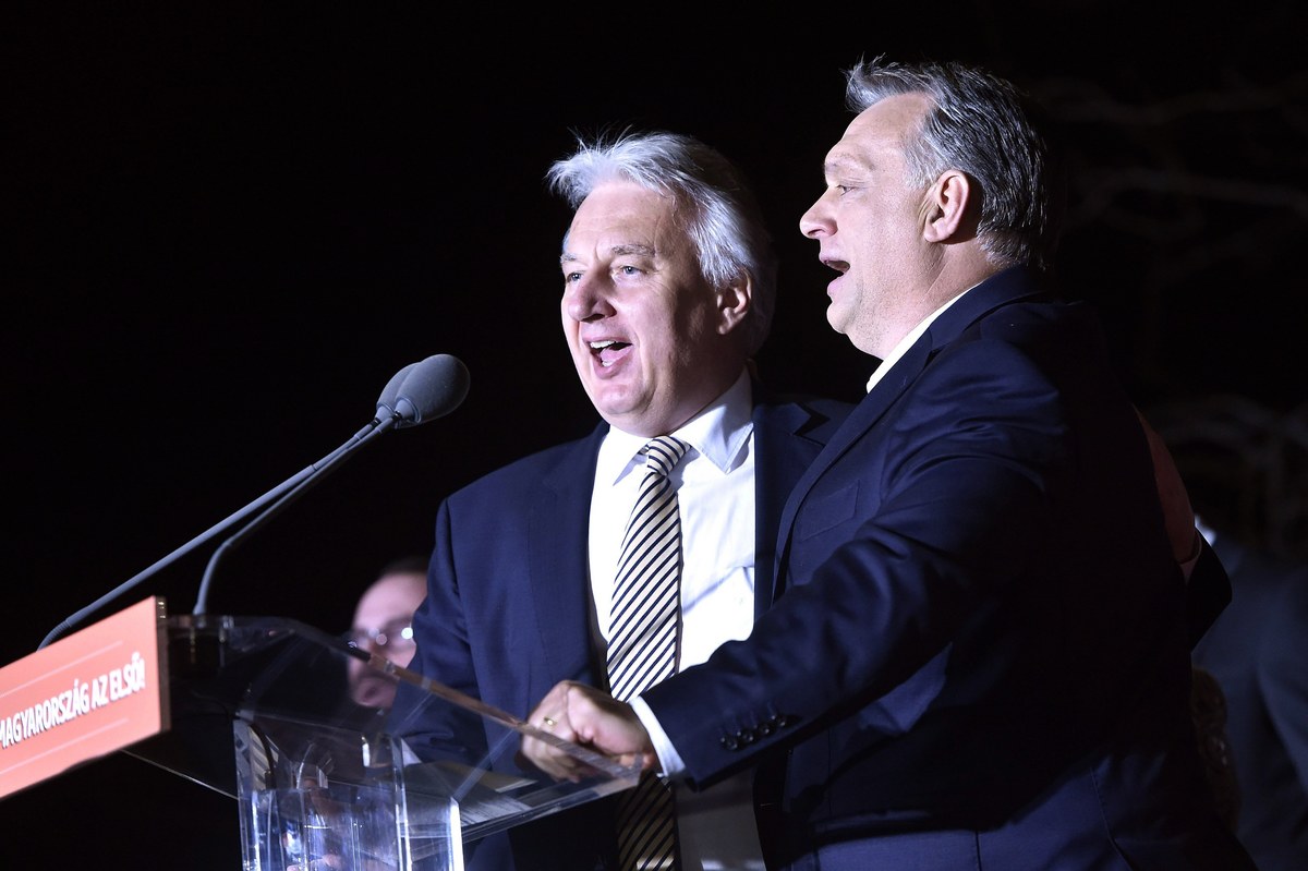 epa06656116 Hungarian Prime Minister and Chairman of Fidesz Party Viktor Orban (R) and Deputy Prime Minister and Chairman of the Christian Democratic Party Zsolt Semjen sing as they celebrate the win of Fidesz and the Christian Democrats at the election night watch event after the general elections in Budapest, Hungary, 08 April 2018. EPA/Zoltan Mathe HUNGARY OUT
