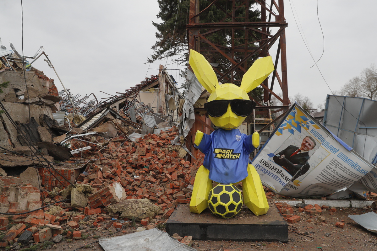 Ποδοσφαιρική μασκότ με τα χρώματα της σημαίας της Ουκρανίας, που γλίτωσε από τους βομβαρδισμούς δίπλα στα συντρίμμια ενός βομβαρδισμένου γηπέδου, Ουκρανία, 09 Απριλίου 2022.