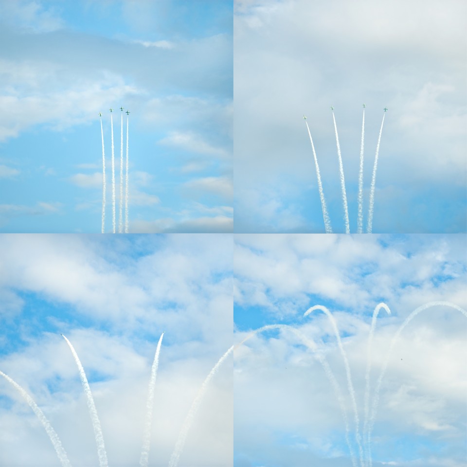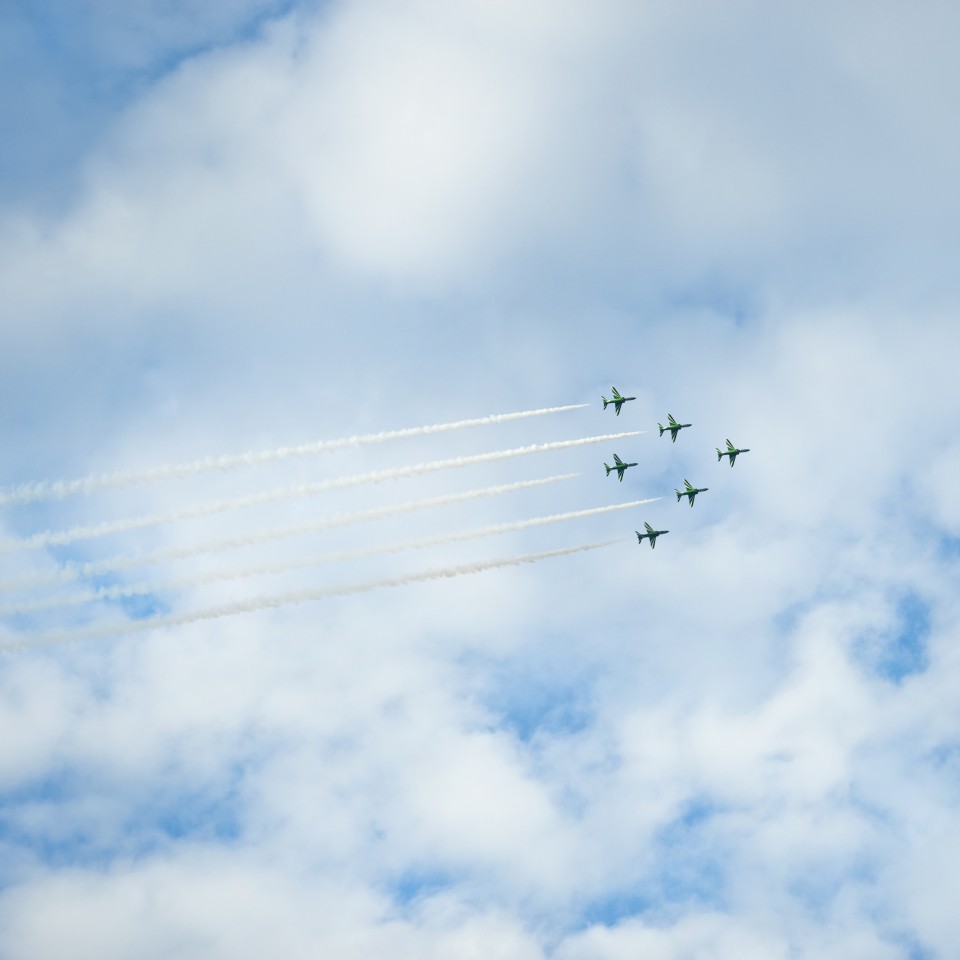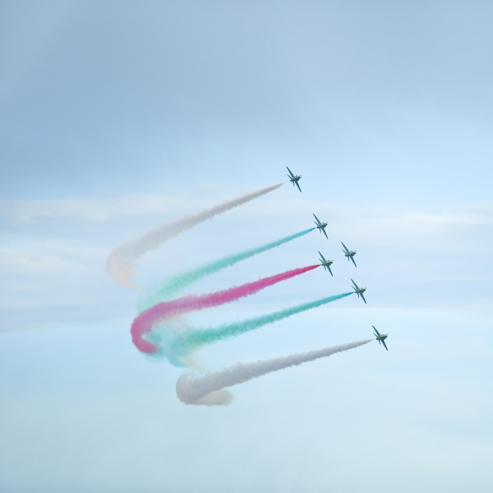 Το κλισέ «σε άψογους σχηματισμούς», που ακούς σε κάθε ελληνική παρέλαση είναι λίγο για να περιγράψει την αίσθηση που σου αφήνουν τα αεροσκάφη των Saudi Hawks όταν περνάνε πάνω από το Κάστρο της Καβάλας. Όταν ο αρχηγός τους, ο σμηναγός Al Humaidi Al Nahsi, δίνει εντολή, ο σχηματισμός «σπάει» και με χρωματιστό καπνό σχηματίζουν το έμβλημα της Σαουδικής Αραβίας, τις δύο σπάθες κάτω από έναν φοίνικα, με το οποίο κατέκτησαν το 2011 το ρεκόρ Γκίνες για τη μεγαλύτερη «ζωγραφιά στον αέρα», μεγέθους 5 εκατομμυρίων τετραγωνικών μέτρων.