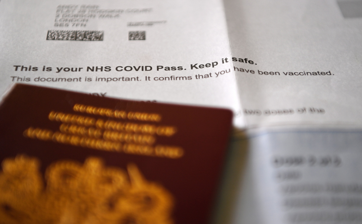 epa09386908 A viwew of a double jabbed NHS COVID pass, in London, Britain, 02 August 2021. The UK government is considering introducing domestic COVID vaccine passports for large scale events. British Prime Minister Boris Johnson however is facing a backlash against the so-called national vaccine passports with calls for Parliament to be recalled from its summer recess, so such proposals can be debated. EPA/ANDY RAIN