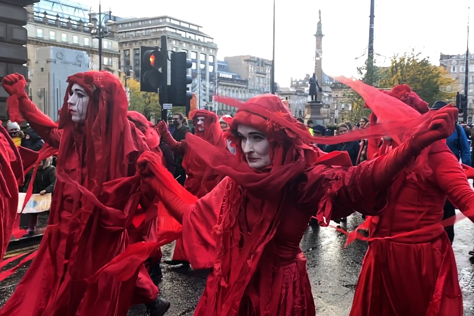 Ωστόσο, τα βλέμματα τραβούσαν αιθέρια πλάσματα, που σαν από άλλο κόσμο, διέσχιζαν αργά και αποφασιστικά τους δρόμους της Γλασκώβης. Οι Red Rebel Brigade με τις κατακόκκινες ενδυμασίες τους και τα πάλλευκα πρόσωπα, συμβόλιζαν το αίμα που μας συνδέει με όλα τα είδη που κατοικούν πάνω στον πλανήτη. Τα δάκρυά τους δεν δίσταζαν να κυλήσουν και η μελαγχολία τους ήταν παραπάνω από εμφανής. Ο λόγος; Πίσω από κλειστές πόρτες, οι πολιτικοί ηγέτες αυτού του κόσμου εξασκούσαν το «μπλα, μπλα, μπλα», όπως καυτηρίαζε συνεχώς και η Greta Thunberg, η οποία συμμετείχε καθημερινά στις πορείες για το κλίμα. Λόγοι έξυπνα ντυμένοι με όμορφες λέξεις και στολισμένοι με φανταχτερές υποσχέσεις ακούγονταν από το βήμα της φετινής διοργάνωσης, η οποία χαρακτηρίστηκε ως η λιγότερο συμπεριληπτική στα χρονικά του COP. Οι πολιτικοί πότε αντάλλασσαν πυρά μεταξύ τους, πότε κολακείες και ουδεμία πρόθεση ή δέσμευση έδειξαν για δραστική αλλαγή στις περιβαλλοντικές πρακτικές, ώστε να μη φτάσουμε στο σημείο χωρίς γυρισμό. Η διατήρηση της αύξησης της θερμοκρασίας στον 1,5 βαθμό Κελσίου μοιάζει όνειρο απατηλό.