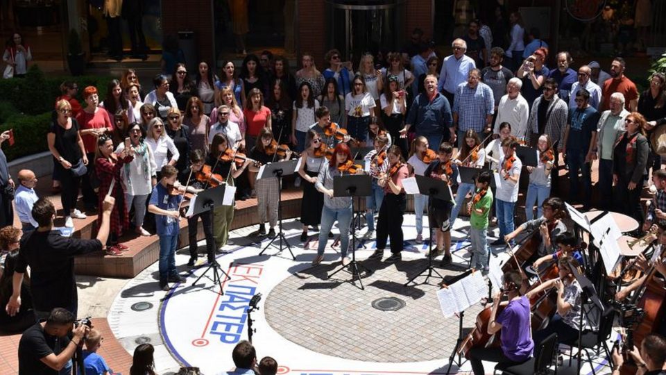 Σάββατο μεσημέρι. Περαστικοί βολτάρουν στα δυο μεγαλύτερα εμπορικά κέντρα της πόλης, όταν ξαφνικά συναντούν την Ορχήστρα Νέων του Μεγάλου Μουσικής Θεσσαλονίκης, MOUSA, και την Μικτή Χορωδία Θεσσαλονίκης. Περισσότερα από 30 άτομα, συντονισμένα υπό την διεύθυνση του μαέστρου Θεόδωρου Παπαδημητρίου, παίζουν την «Ωδή στην Χαρά» (από την 9η συμφωνία του Μπετόβεν), ωδή που από το 1985 αποτελεί τον επίσημο ύμνο της Ευρωπαϊκής Ένωσης.