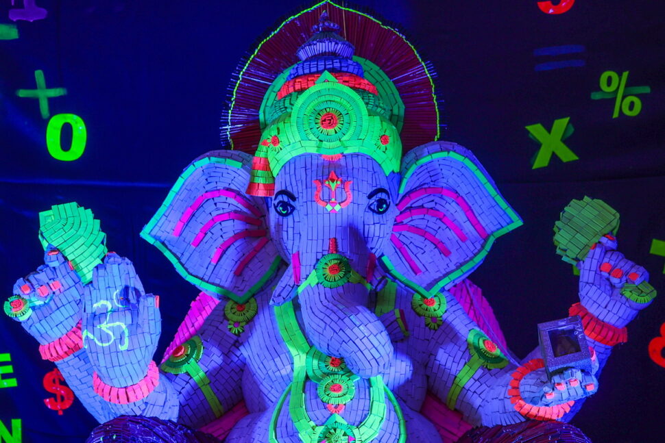 Στη Βομβάη, περίτεχνα διακοσμημένα είδωλα της ελεφαντοκέφαλης ινδουιστικής θεότητας με ύψος μέχρι και τρία μέτρα, βαπτισμένα στα πιο ψυχεδελικά χρώματα και φτιαγμένα από τα πιο απρόσμενα υλικά -γομολάστιχες και μολύβια, πιόνια από σκάκι, χνουδωτά πομ-πομ, ξηρούς καρπούς- λατρεύονται σε εκατοντάδες pandals ή αυτοσχέδιες σκηνές, που οι πιστοί επισκέπτονται καθημερινά για να προσευχηθούν και να προσφέρουν στην αγαπημένη τους θεότητα γλυκά, φρούτα και όλως των ειδών τις λιχουδιές, παρακαλώντας για την εύνοιά του.