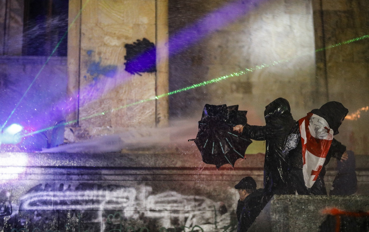 Η αστυνομία χρησιμοποιεί κανόνια νερού για να διαλύσει τους διαδηλωτές μπροστά από το κτίριο του Κοινοβουλίου στην Τιφλίδα, Γεωργία, 01 Δεκεμβρίου 2024. EPA/DAVID MDZINARISHVILI