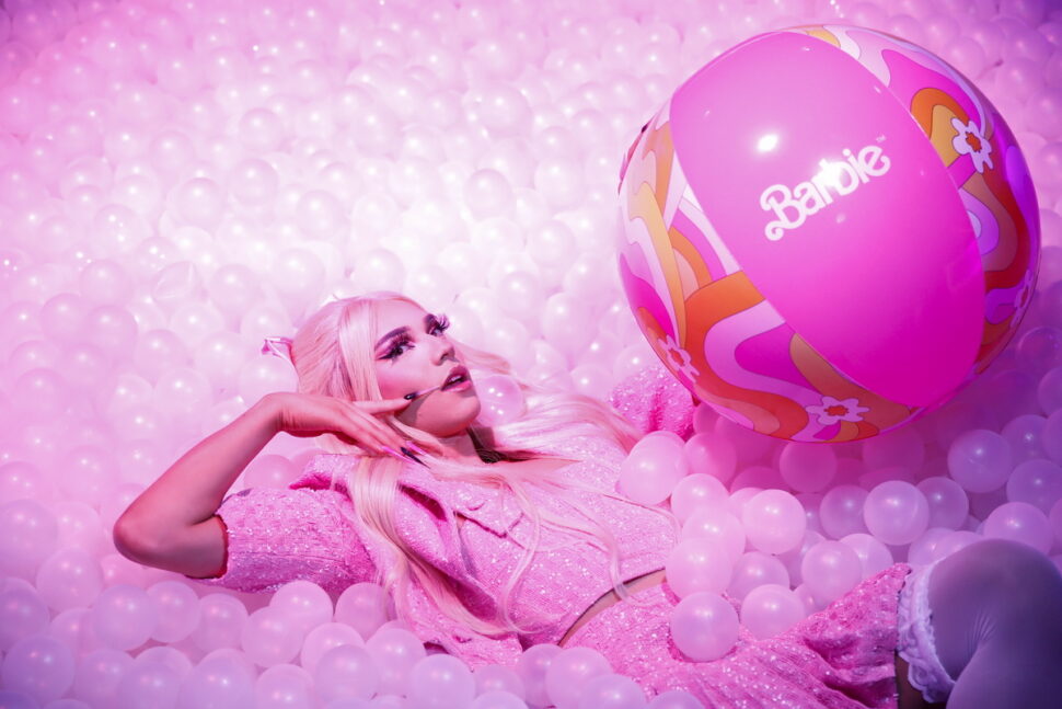 Η Clawdeena ποζάρει σε ένα δωμάτιο γεμάτο με ροζ μπάλες. World of Barbie, Σάντα Μόνικα, Καλιφόρνια, ΗΠΑ, 12 Απριλίου 2023. EPA/CAROLINE BREHMAN