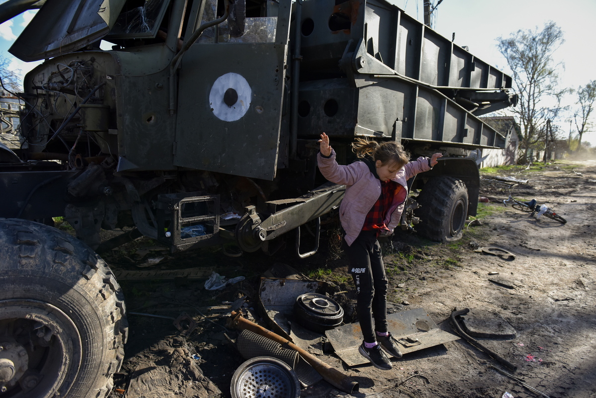 Ένα κορίτσι πηδά από ένα ρωσικό στρατιωτικό φορτηγό. Λουκάσιβκα, Ουκρανία, 27 Απριλίου 2022.