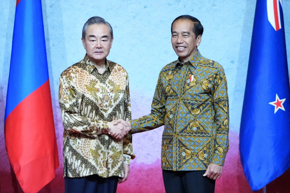 Ο Πρόεδρος της Ινδονησίας Joko Widodo σφίγγει τα χέρια με τον επικεφαλής εξωτερικής πολιτικής του Κινεζικού Κομμουνιστικού Κόμματος Wang Yi. EPA/ACHMAD IBRAHIM