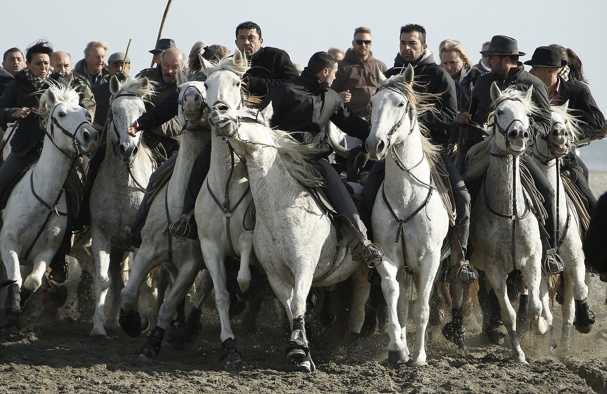 epaselect epa06320391 Camargue guardians on horseback ride along the beach of Saintes Maries de la Mer, southern France, 10 November 2017, during the traditional Camargue 'abrivado' where they escort bulls between horses. EPA/GUILLAUME HORCAJUELO