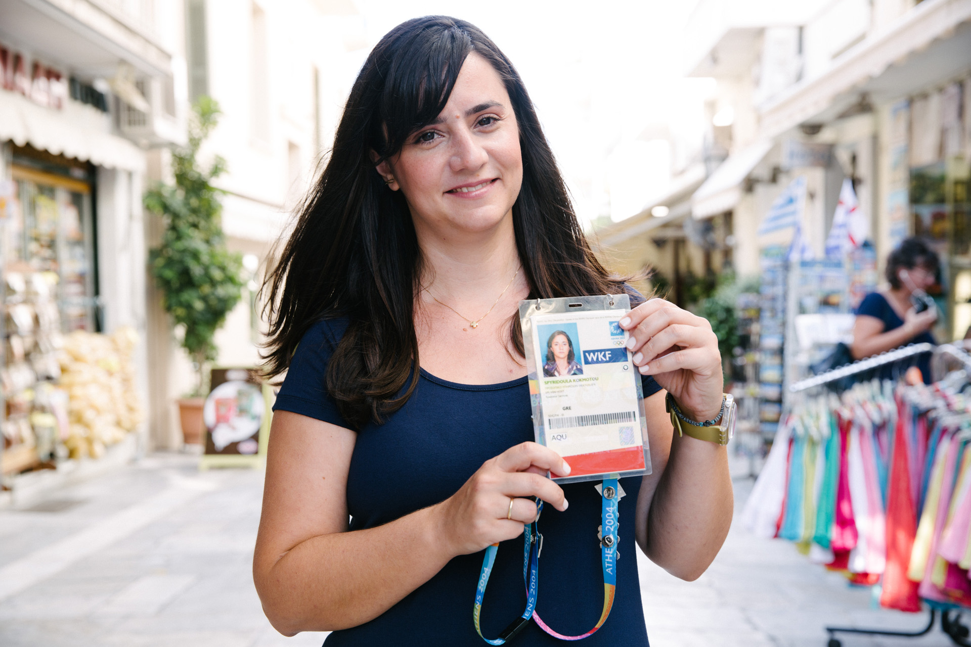 Η Σπυριδούλα Κοκμοτού ήταν εθελόντρια τον αγώνων του 2004 και όχι μόνο, μια και ο εθελοντισμός είναι η αξία που την καθοδηγεί εδώ και πολλά χρόνια. Σήμερα εργάζεται σαν υπεύθυνη εθελοντικού προγράμματος για το Ελληνικό Παιδικό Μουσείο, στην Πλάκα. Η Popaganda την βρήκε στο γραφείο της και μίλησε μαζί της για το πώς έζησε τον εθελοντισμό στην Ολυμπιάδα. Μαζί έφερε και την διαπίστευσή της με κρεμασμένα διάφορα αναμνηστικά pins επάνω της. «Τα ανταλλάζαμε με τους τουρίστες. Ήταν το αγαπημένο μας» θα πει λίγο πριν την συνέντευξη.