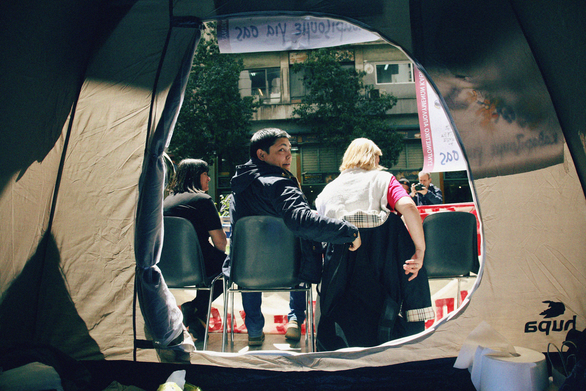Από σήμερα, 7 Μαΐου 2014, οι απολυμένες καθαρίστριες του Υπουργείου Οικονομικών συνεχίζουν τον αγώνα τους με καθιστική διαμαρτυρία, έξω από το Υπουργείο Οικονομικών στο Σύνταγμα. Οι γυναίκες αυτές βρίσκονται από τις 18 Σεπτεμβρίου 2013 σε καθεστώς διαθεσιμότητας. Στις 18 Μαΐου χάνουν επισήμως τη δουλειά τους, απολύονται ώστε να μειωθούν τα ελλείμματα και να εξυγιανθεί ο δημόσιος τομέας. Για να ακριβολογούμε, το καθεστώς διαθεσιμότητας δεν είναι παρά ένα ευγενικό ταυτόσημο της απόλυσης, η μείωση των ελλειμμάτων είναι ούτως ή άλλως ένας μύθος, ενώ «εξυγίανση» σημαίνει συνήθως οριζόντιες απολύσεις με τα μάτια κλειστά και «ανάπτυξη» σημαίνει πλέον «όποιον πάρει ο Χάρος». Αυτό το μιντιακό παιχνίδι λέξεων φαίνεται πως προβληματίζει και τις ίδιες τις εργαζόμενες, που γνωρίζουν καλύτερα από κάθε κανάλι πόσο ακριβώς «κοστίζουν» στο Ελληνικό Δημόσιο και με ποιους ακριβώς θα αντικατασταθούν. Έχουν στήσει τα πανό τους, τη σκηνή τους και τις σκούπες τους πάνω την Καραγεώργη Σερβίας και, όπως λένε, δεν έχουν λόγο πια να κάνουν πίσω, ακόμη κι όταν ένας αστυνομικός τις ειδοποίησε ότι θα έρθει η δημοτική αστυνομία. «Ας έρθει κι ο ίδιος ο κύριος Καμίνης» του είπαν. «Με ανοιχτές αγκάλες τον περιμένουμε».