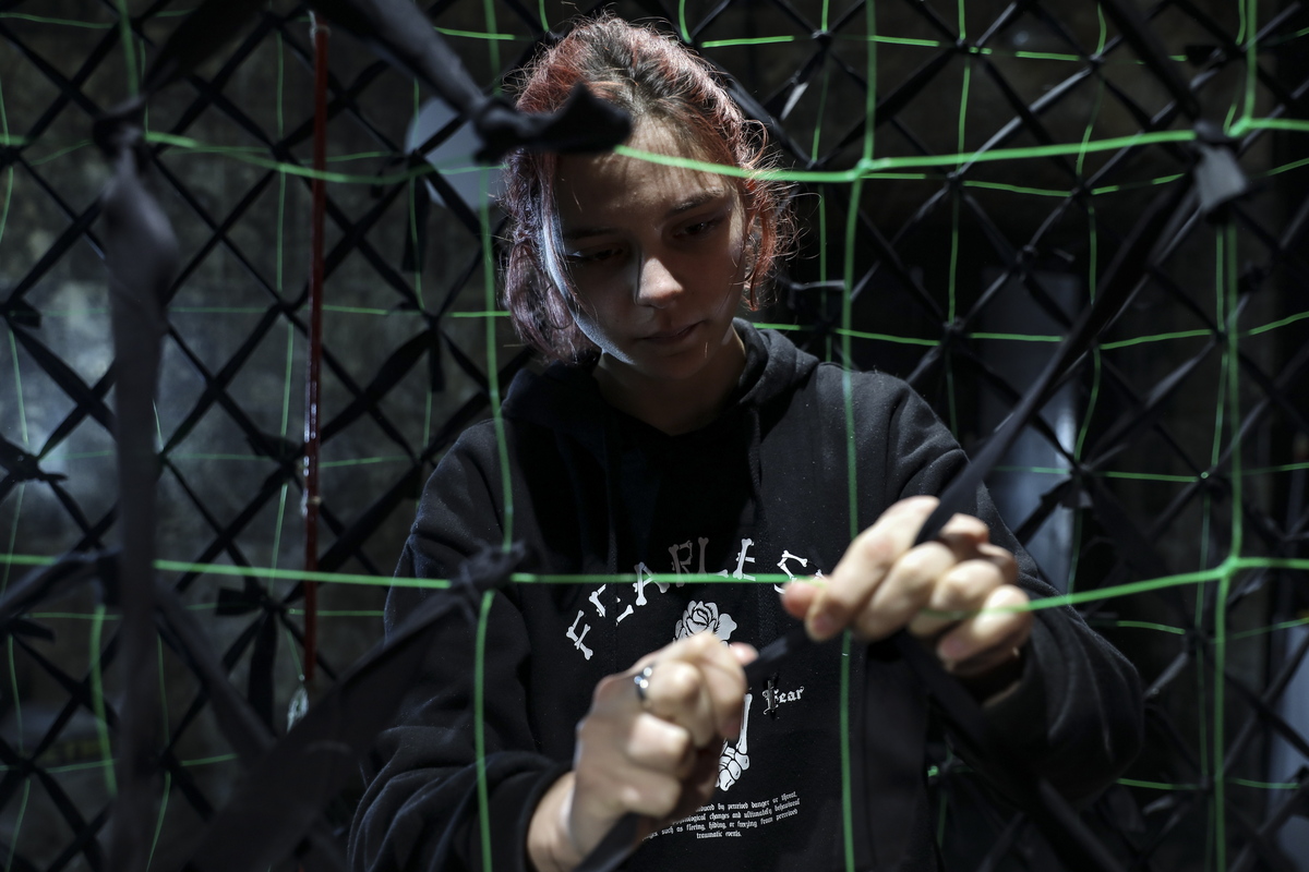 Νεαρή γυναίκα δένει έναν κόμπο σε δίχτυ καμουφλάζ, που ετοιμάζει μαζί με ομάδα εθελοντών για τον ουκρανικό στρατό, το οποίο θα χρησιμοποιηθεί ενάντια στον ρωσικό στρατό. Τα δίχτυα κατασκευάζονται σε βιβλιοθήκες, σχολεία, γυμναστήρια και άλλους διαθέσιμους χώρους. Λβιβ, Ουκρανία, 07 Μαρτίου 2022. EPA/MIGUEL A. LOPES