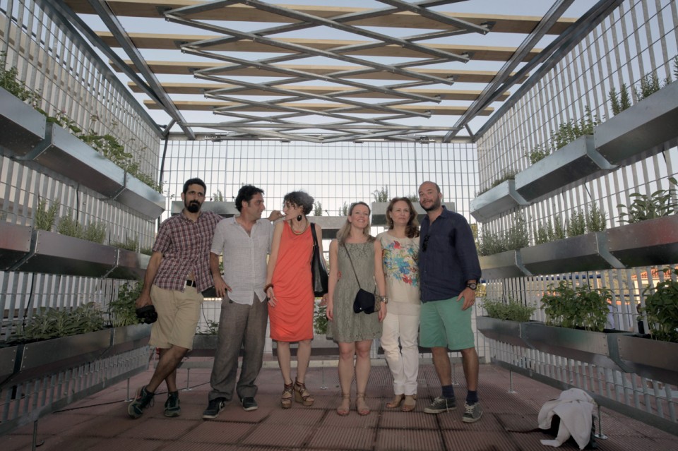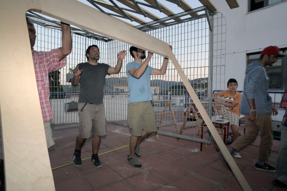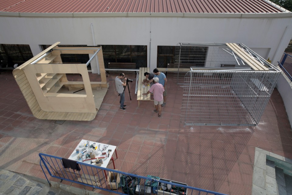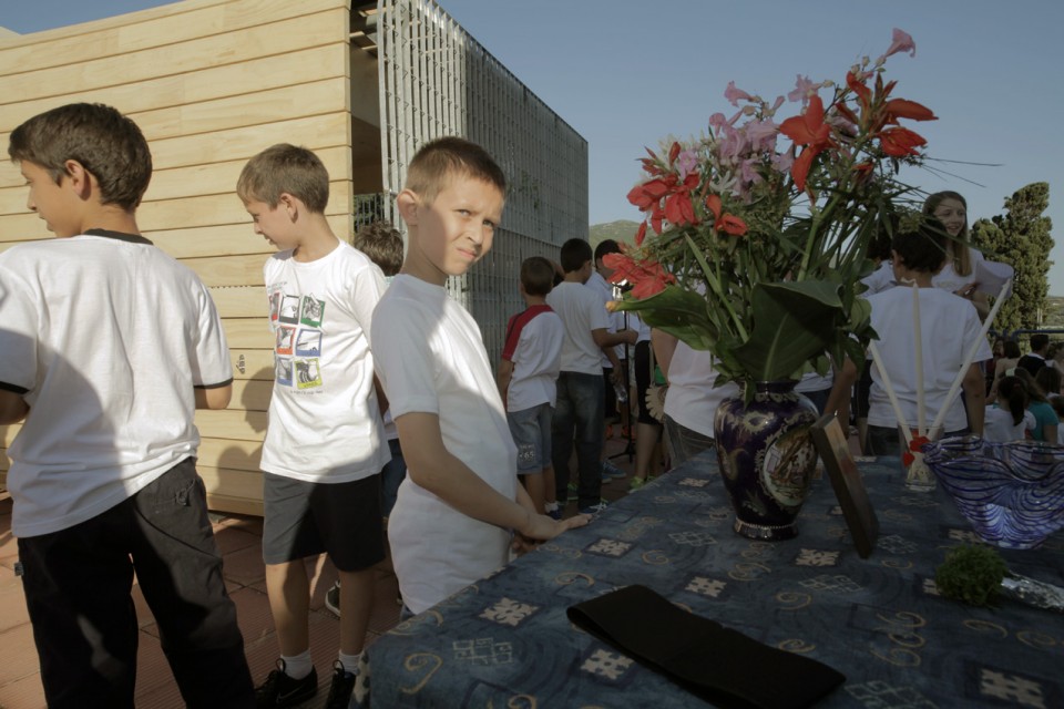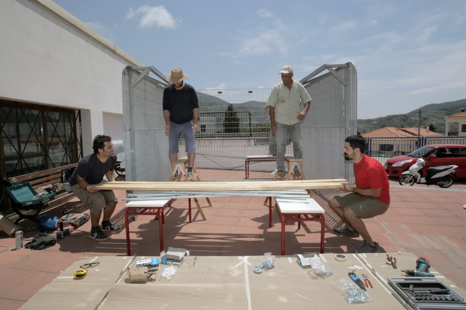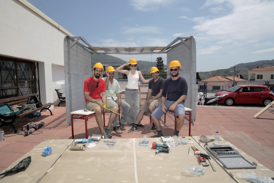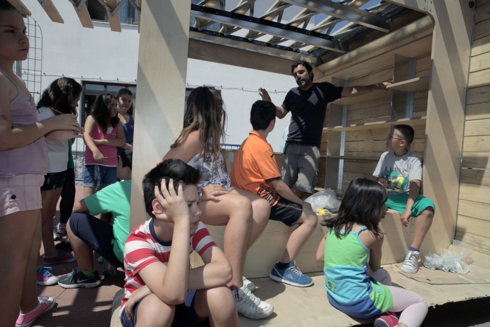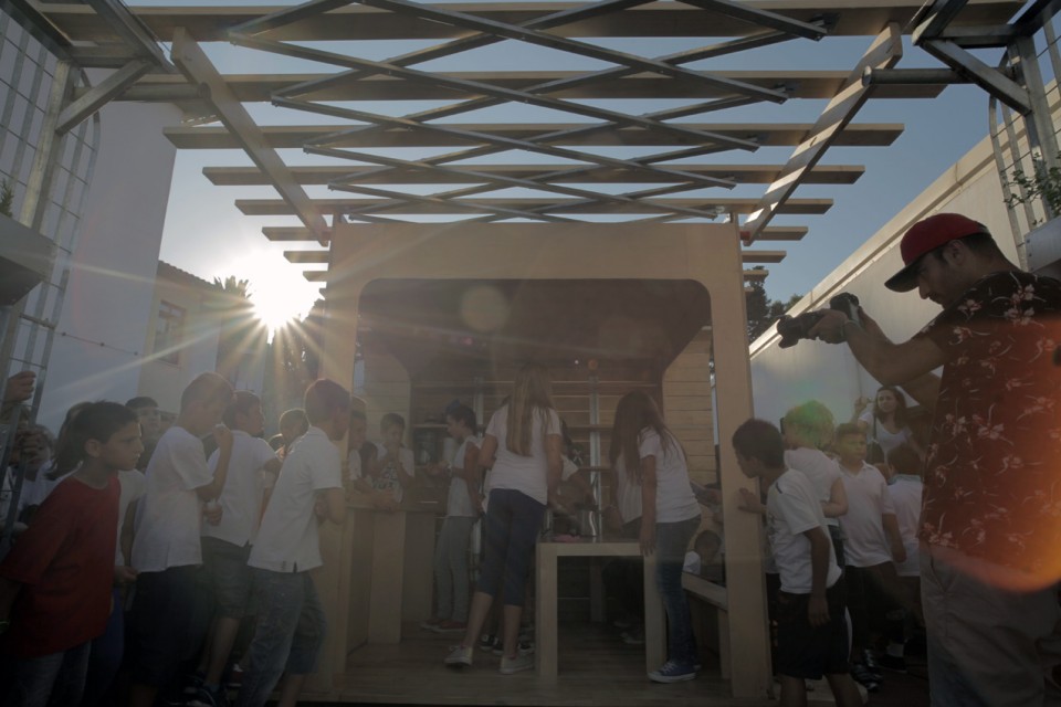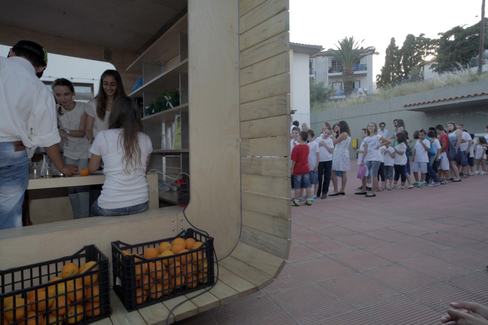 Μετά και από τον «πατροπαράδοτο» αγιασμό, έφτασε η στιγμή για τα «αποκαλυπτήρια». Ο Στέφανος Νόλλας, υπεύθυνος του προγράμματος, μαζί με κάποιους από τους μαθητές άνοιξαν το περίπτερο «σαν ακορντεόν», όπως εύστοχα μας είχε το περιγράψει νωρίτερα. Μέσα σε λίγα λεπτά, όλοι οι μαθητές μαζεύτηκαν τριγύρω –παράλληλα ακούγονταν ήχοι πουλιών-  και αμέσως πέρασαν στη δράση, στύβοντας πορτοκάλια και προσφέροντάς τα στους φίλους τους. Κάποιο από τα παιδιά απόρησε: «και όταν βρέξει τι θα γίνει»; Ευτυχώς επ’ αυτού έχει ήδη μεριμνήσει ο μη κερδοσκοπικός οργανισμός, Ινστιτούτο Κοινός Τόπος που για μία εβδομάδα βρισκόταν στο νησί για την κατασκευή του περιπτέρου. Οι αρχιτέκτονες Ζωή Λάγγη, Παύλος Αγάθης, Μάνος Βορδοναράκης και Γιάννης Παπαγιαννάκης έψαξαν και βρήκαν τη σωστή ξυλεία που δεν κινδυνεύει από τη βροχή και μπορούν να υπόσχονται υπερήφανα ότι το περίπτερο θα μείνει εκεί βρέξει-χιονίσει. Μαζί τους ήταν και η Νίκη Καράλη η οποία είχε αναλάβει να προκαλέσει ακόμη περισσότερο το ενδιαφέρον των παιδιών, με πολλή διαδραστικότητα, όπως το θεατρικό παιχνίδι.