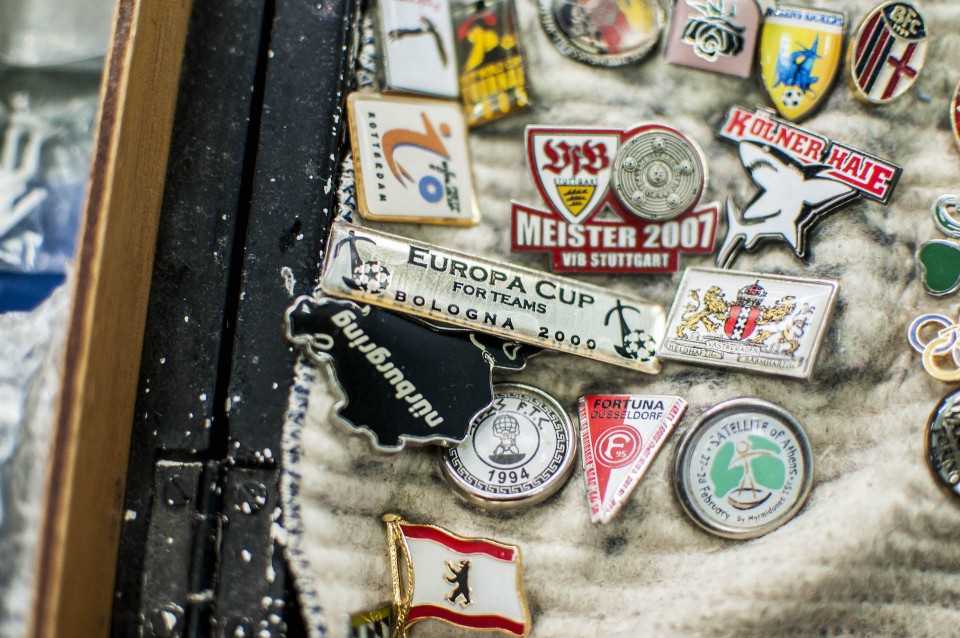 Vintage κονκάρδες διακοσμούν το κουτί ενός παίκτη. Λεπτομέρεια η θρυλική πίστα αγώνων ταχύτητας του Νίρμπουγκρινγκ.