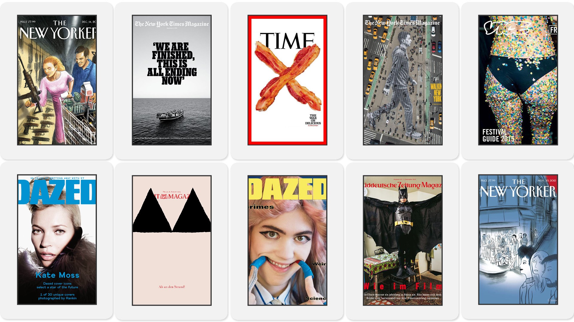 Η προσφυγική κρίση, η περίπτωση της Kim Kardashian, ο Donald Trump, το σεξ στην εποχή των smartphones, η Άνγκελα Μέρκελ, οι τρομοκρατικές επιθέσεις στο Παρίσι. Αυτά είναι μόνο μερικά από τα πρόσωπα και τα γεγονότα, όπως φιλοξενήθηκαν στα εξώφυλλα του διεθνή Τύπου το 2015. Η Popaganda διαλέγει τα 30 πιο επιδραστικά και δημιουργικά από αυτά.