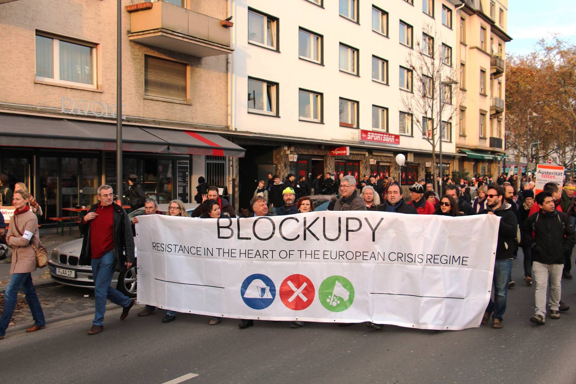 Κάτι έγινε λοιπόν πριν 15 μέρες – και ειδικότερα το Σαββατοκύριακο 22-23/11 – στην Φρανκφούρτη της Γερμανίας. Δεν το είπαν οι ειδήσεις, γιατί που να εξηγούν τώρα, άλλα μαζεύτηκαν κάποιες χιλιάδες από όλη την Ευρώπη για την διοργάνωση του Blockupy. Πρόκειται για μια διεθνή πρωτοβουλία, στην οποία που συμμετέχουν κοινωνικά κινήματα, πρωτοβουλίες πολιτών, κοινωνικές και πολιτικές οργανώσεις, ινστιτούτα, διανοούμενοι, εργαζόμενοι σε συνδικάτα. Είναι ένας συνδυασμός των κινημάτων Blockade και Occupy κι αποτελεί μια από τις 2-3 μεγαλύτερες δικτυώσεις σε ευρωπαϊκό επίπεδο.