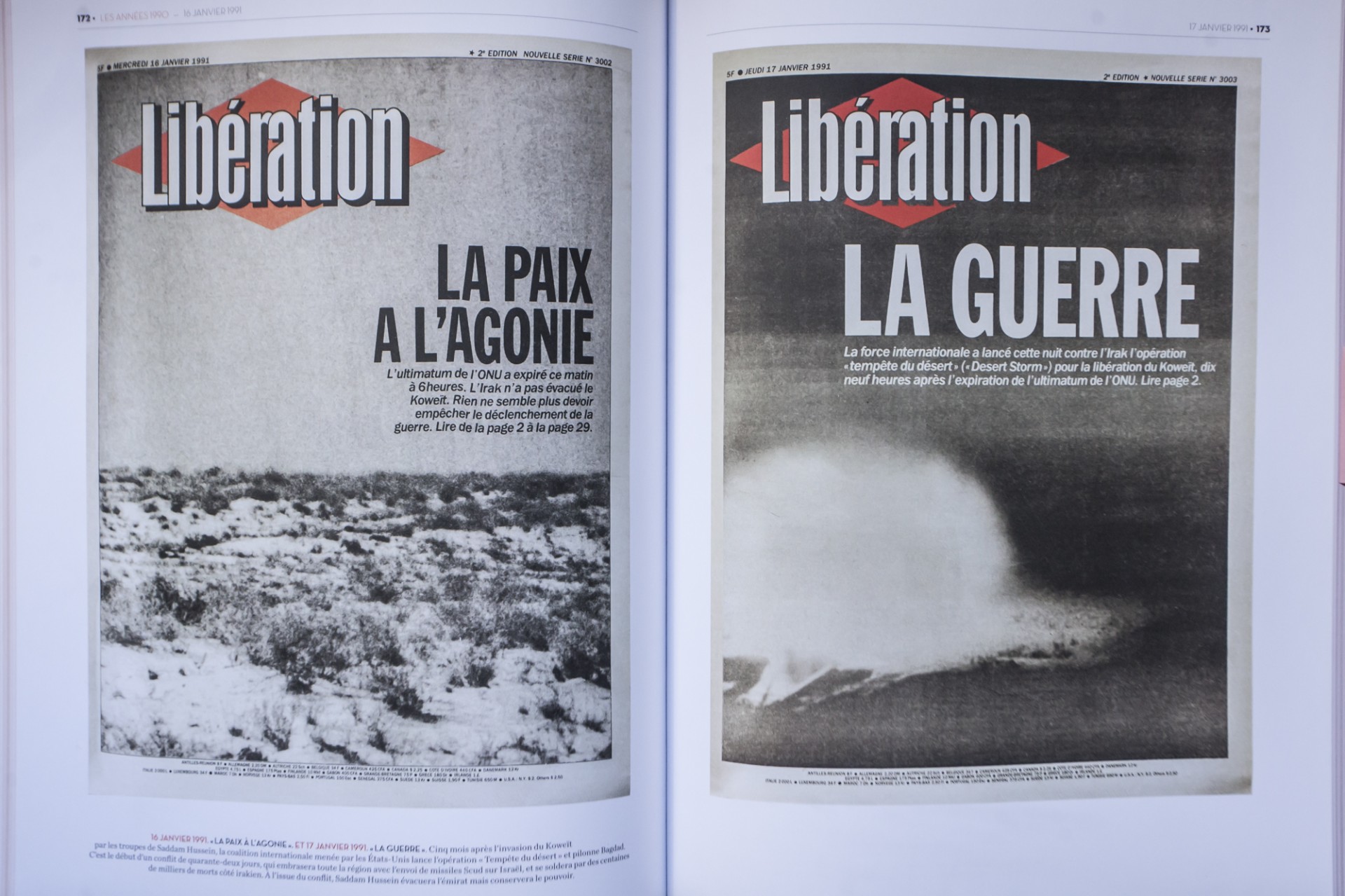 Αριστερά, 16 Ιανουαρίου 1991: Η ειρήνη αγωνιά .Δεξιά, 17 Ιανουαρίου 1991, Πόλεμος