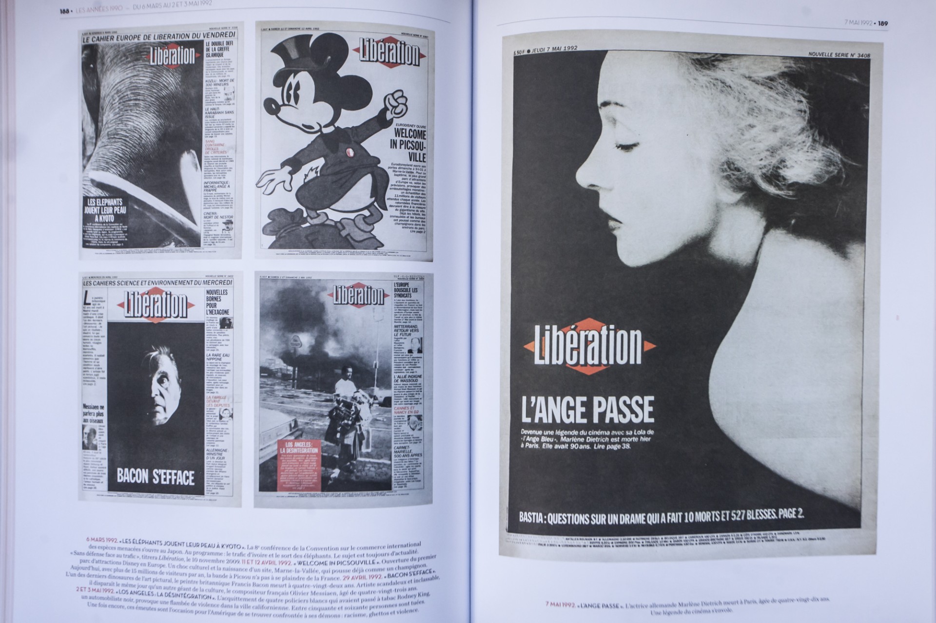 7 Μαϊου 1992 , με μία φράση πολλαπλών ερμηνειών (που όλες τους όμως ταιριάζουν στην περίπτωση) ο θάνατος της Μάρλεν Ντήτριχ στην πρώτη σελίδα. Αριστερά, πρωτοσέλιδα του 1992 για την έναρξη της Συνδιάσκεψης για την προστασία των απειλούμενων με εξαφάνιση ειδών, τα εγκαίνια της Γιουροντίσνεϊ έξω από το Παρίσι (Καλως ήλθατε στην Πόλη του Σκρουτζ), ο θάνατος του Φράνσις Μπέικον και οι φυλετικές ταραχές στο Λος Άντζελες