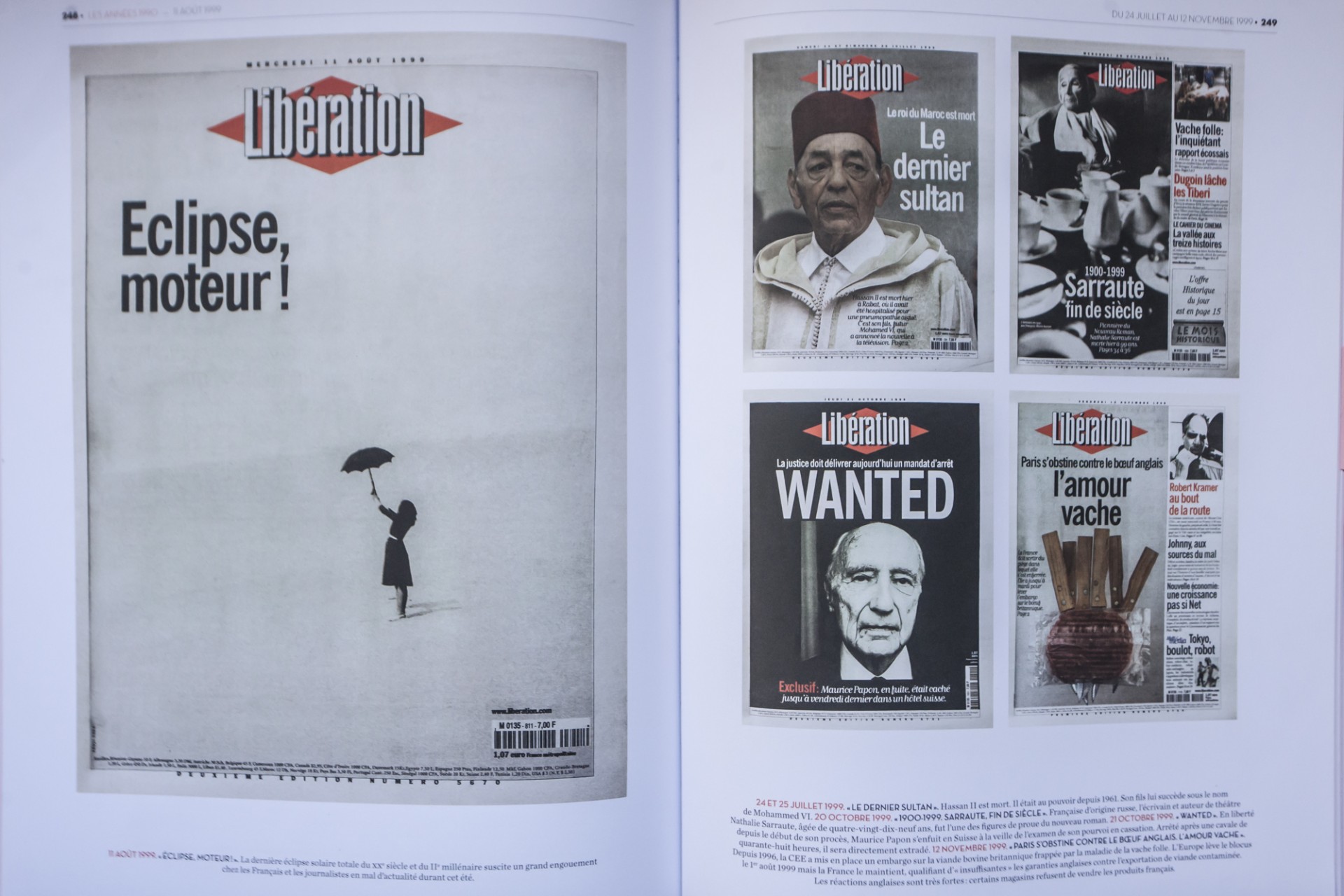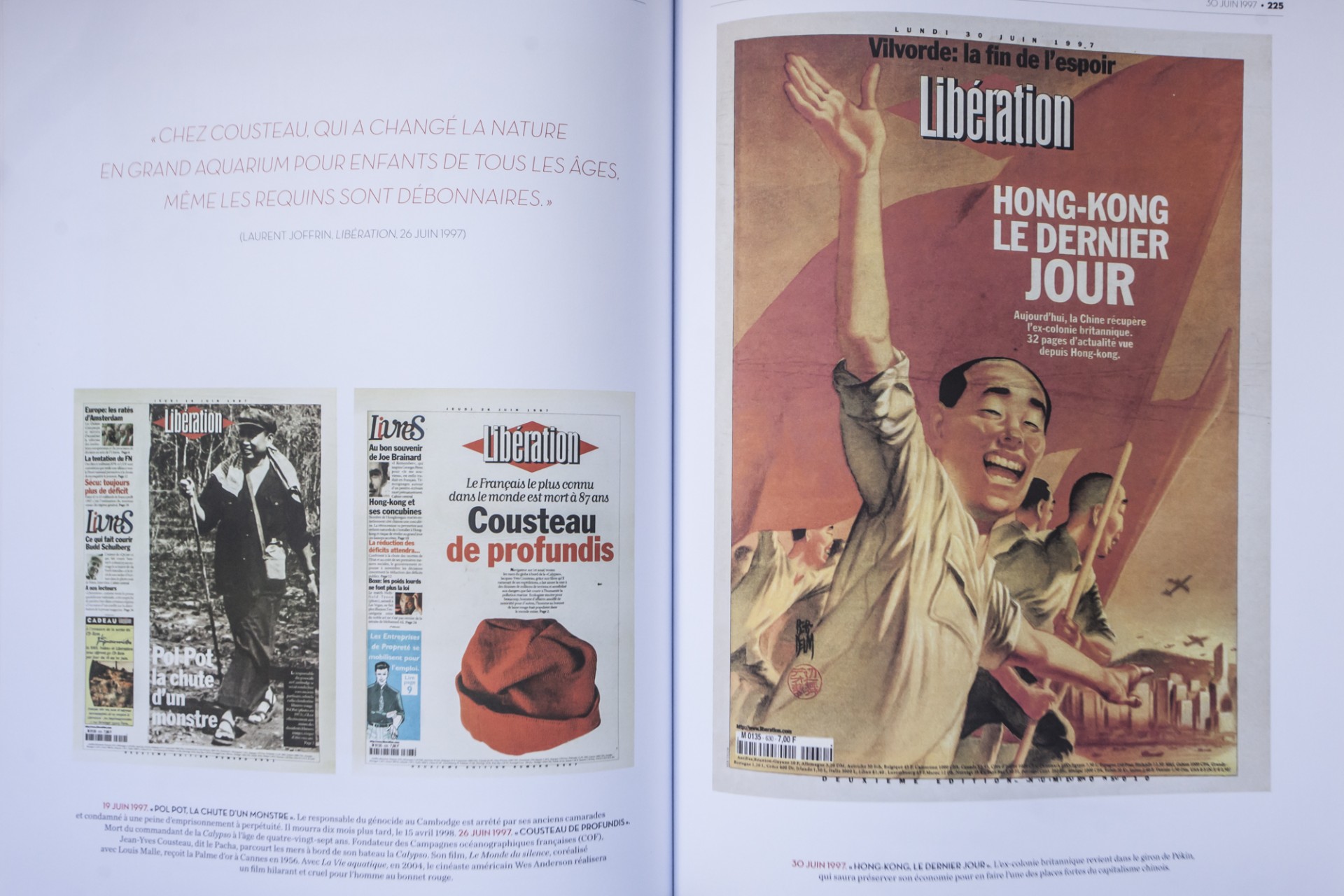 Δεξιά, 30 Ιουνίου 1997 :Χονγκ Κόνγκ, η τελευταία ημέρα, αριστερά : Πολ Ποτ, η πτώση ενός τέρατος, τίτλος που χαιρετίζει τη σύλληψη του εξολοθρευτή της Καμπότζης και Κουστώ de profundis με τον εμβληματικό μπερέ του ωκεανογράφου που πέθανε στις 25 Ιουνίου του 1997