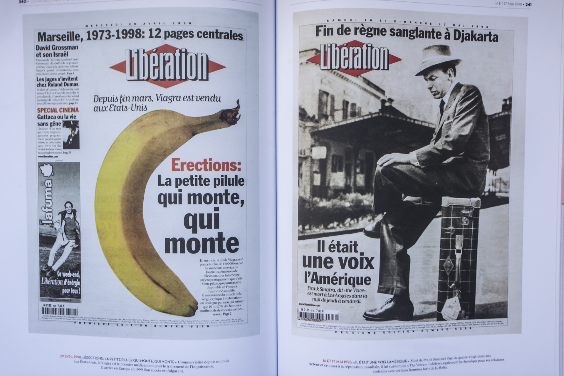 Αριστερά:Το viagra αρχίζει να πωλείται στις ΗΠΑ.Ο τίτλος δίπλα στη μπανάνα: Στύσεις: το μικρό χάπι που ανεβαίνει, ΑΝΕΒΑΙΝΕΙ. Δεξιά, 16-17 Μαϊου 1998, θάνατος του Φρανκ Σινάτρα, και τίτλος-λογοπαίγνιο με αναφορές στην ταινία Κάποτε στην Αμερική