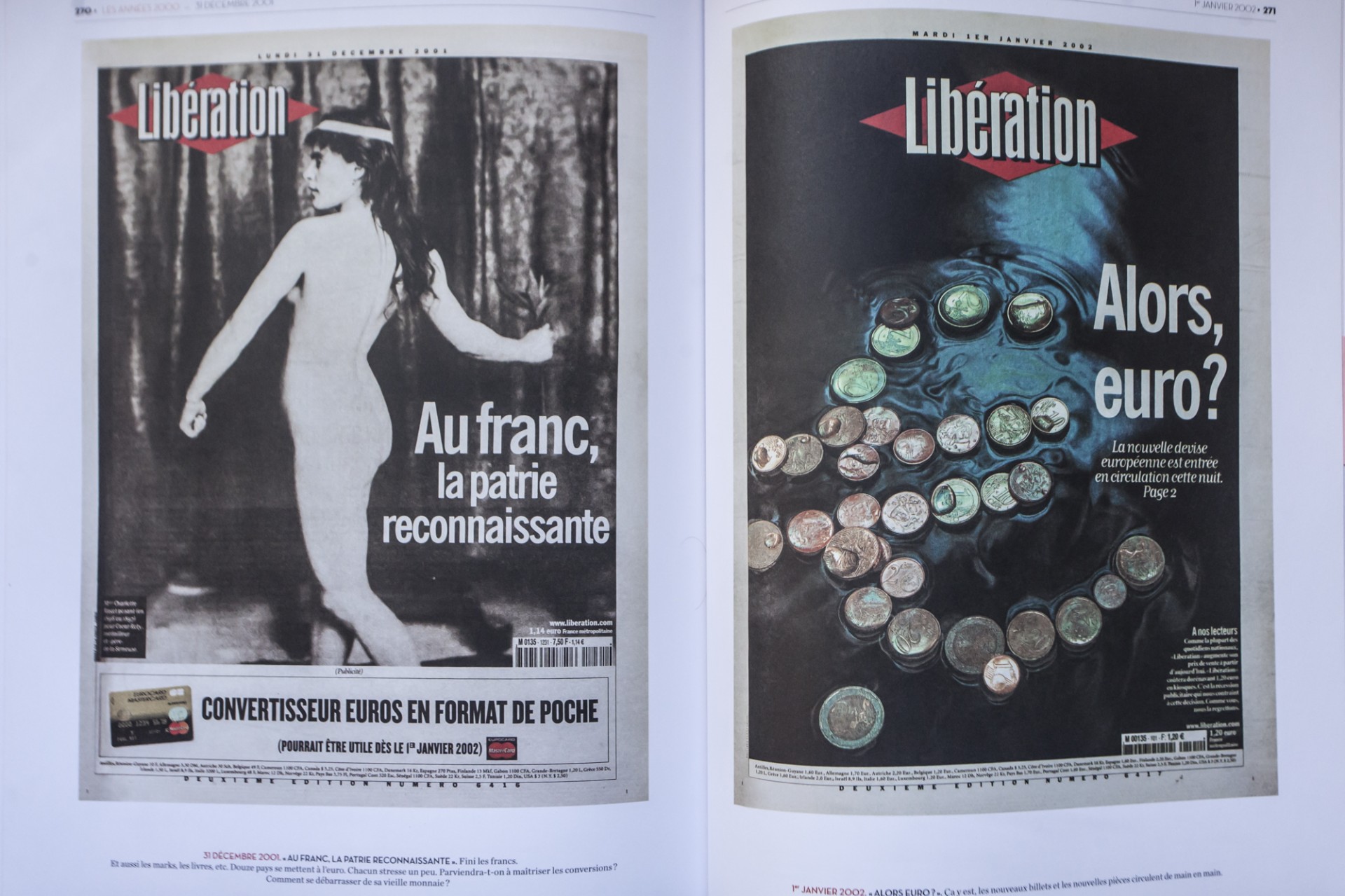 31 Δεκεμβρίου 2001: Με μία φωτογραφική αναπαράσταση της φιγούρας που κοσμούσε το γαλλικό φράγκο η Liberation αποχαιρετά το εθνικό νόμισμα. Στο φράγκο, η πατρίς ευγνωμονούσα γράφει ο τίτλος. Δεξιά, 1η Ιανουαρίου 2002 : Λοιπόν, Ευρώ;