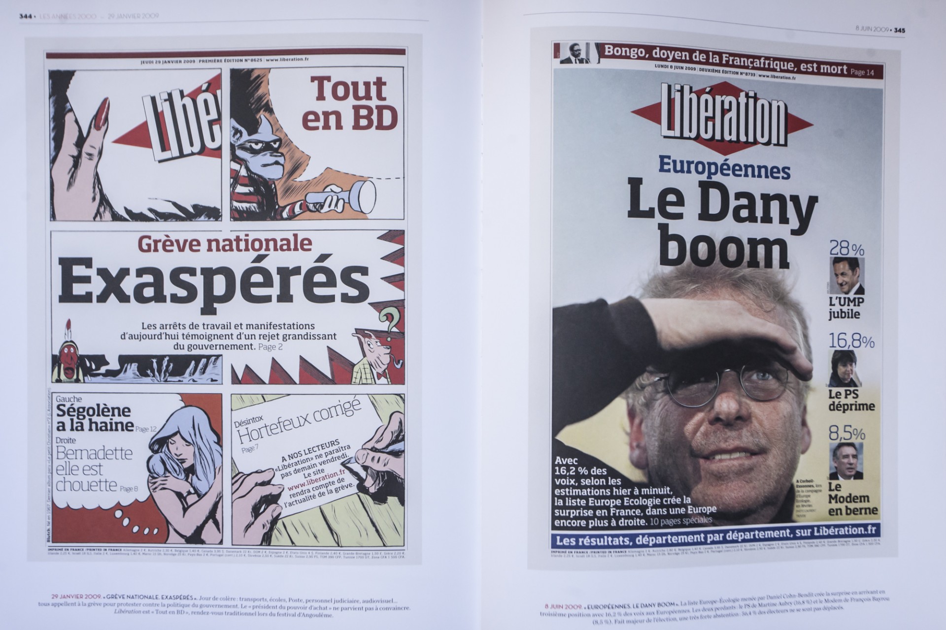 Αριστερά το πρωτοσέλιδο για την ημέρα της Γενικής Απεργίας στις 29 Ιανουαρίου 2009. Δεξιά ο Ντανιέλ Κον Μπεντίτ κάνει την έκπληξη τις Ευρωεκλογές της 7ης Ιουνίου 2009
