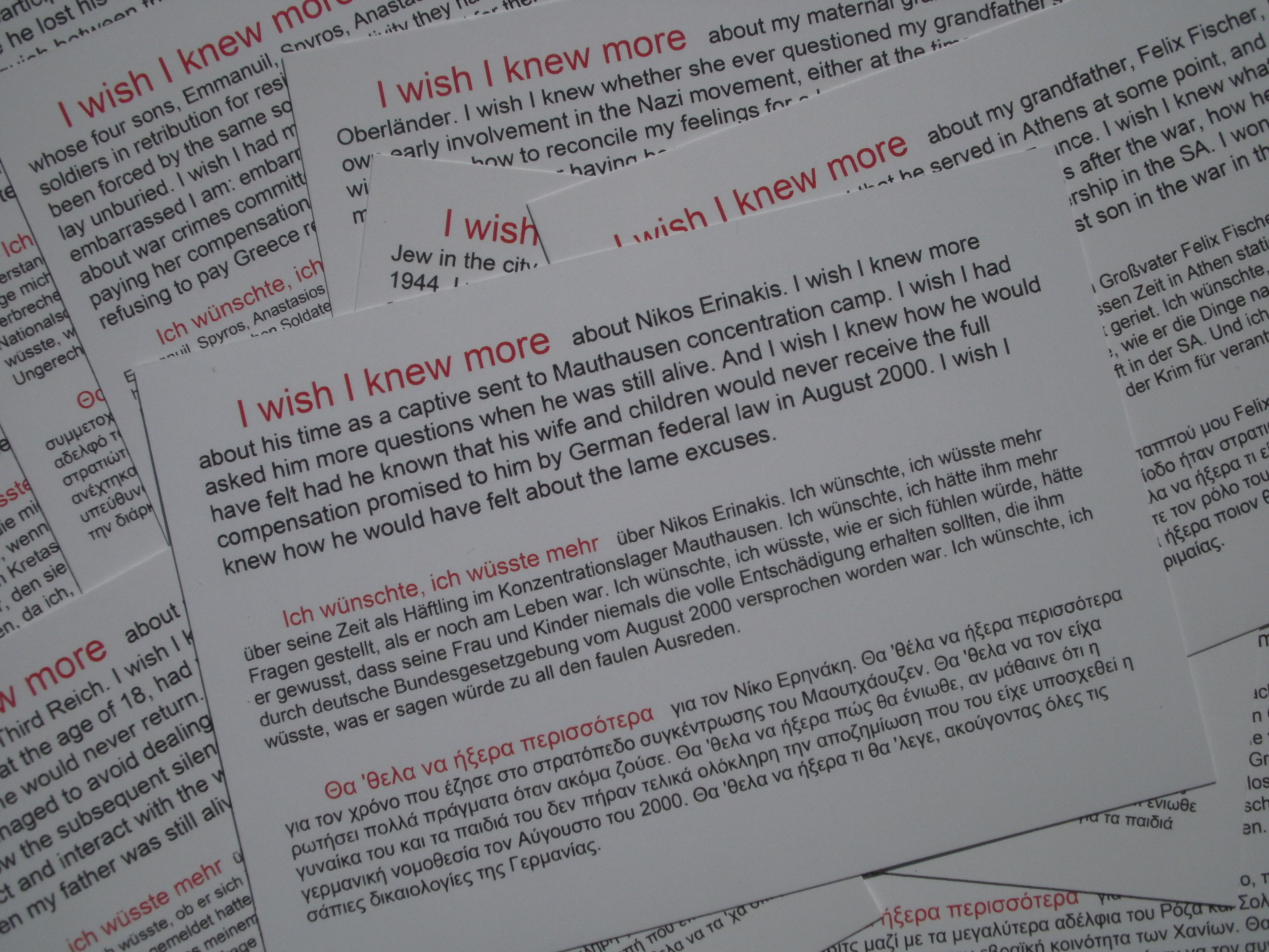 «Το project μου με τίτλο “I wish I knew more” – “Ich wünschte, ich wüsste mehr” – «Θα ‘θελα να ήξερα περισσότερα» – επαναφέρει οδυνηρές μνήμες από τον Δεύτερο Παγκόσμιο Πόλεμο. Όχι όμως με σκοπό να ρίξω εκ νέου φως στα εγκλήματα των Ναζί καθ’ εαυτά – αυτή είναι η δουλειά των ιστορικών. Εμένα με απασχολεί ο ρόλος που παίξανε και συνεχίζουν να παίζουν οι μεταπολεμικές γενιές στη δημόσια απόκρυψη (σχήμα οξύμωρο μεν, όμως γερμανική πραγματικότητα δε) των επιπτώσεων του πολέμου στην μεταπολεμική εποχή μέχρι και σήμερα. Δημιούργησα λοιπόν εννέα καρτ-ποστάλ με κείμενα που σχετίζονται με το θέμα αυτό και τις τοποθετώ σε καφετέριες των Χανίων της Κρήτης, όπου μένω εδώ και 23 χρόνια, και του Αμβούργου της Γερμανίας όπου γεννήθηκα και μεγάλωσα. Τα κείμενα, όπως κι ο τίτλος του project, είναι πολύ προσωπικά επειδή θέλω να απομακρυνθώ όσο το δυνατόν περισσότερο από την δικαιολογία που κυριάρχησε μετά τον πόλεμο στην συντριπτική πλειοψηφία των Γερμανών «Δεν ξέραμε τίποτα για όλα αυτά…». Υπάρχει, τέλος, και μια δέκατη, άδεια κάρτα, την οποία καλείται ο κάθε ένας να συμπληρώσει ο ίδιος. Κι αυτό, επειδή παραμένουν πολλές απορίες: Απορίες που πηγάζουν από το γεγονός ότι η σιωπή κυριαρχούσε τόσο στις οικογένειες των θυμάτων όσο και στις οικογένειες των εγκληματιών. Απορίες σχετικά με το πώς δεν αποδόθηκε ποτέ δικαιοσύνη για τα γερμανικά εγκλήματα πολέμου στην Ελλάδα και γενικότερα για τα εγκλήματα των Ναζί σε όλη την Ευρώπη, αλλά και απορίες με το πώς αποδέχονται νέοι Έλληνες, Γερμανοί κι άλλοι Ευρωπαίοι τόσα χρόνια μια κατάσταση ατιμωρησίας που υπονομεύει τα θεμέλια του κράτους δικαίου, της δημοκρατίας και των ευρωπαϊκών σχέσεων».