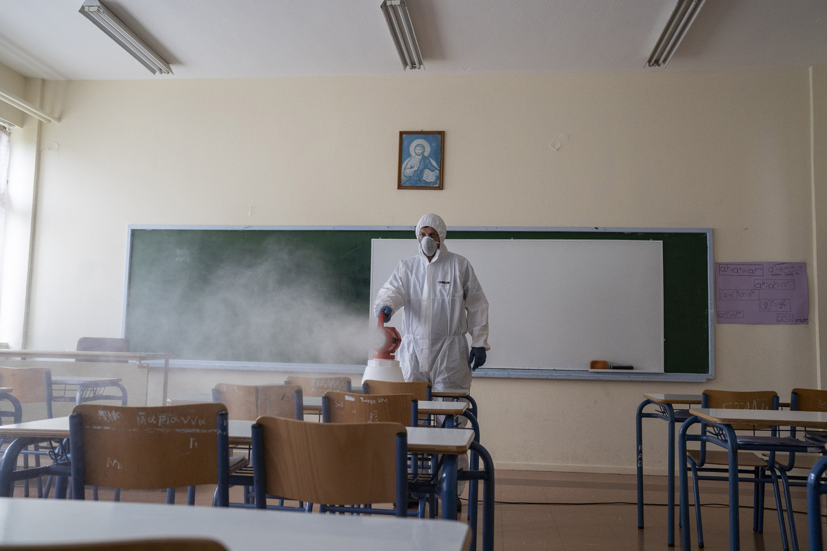 Συνεργείο πραγματοποιεί απολύμανση σε σχολείο, τη Δευτέρα 23 Μαρτίου 2020,στα Ιωάννινα. Σε ισχύ τέθηκε στις 6 το πρωί η εφαρμογή των πρόσθετων αυστηρών μέτρων με απαγόρευση κυκλοφορίας, για τον περιορισμό της διάδοσης του κορονοϊού, που ανακοίνωσε στο μήνυμά του ο πρωθυπουργός Κυριάκος Μητσοτάκης. ΑΠΕ ΜΠΕ/ΑΠΕ ΜΠΕ/ΔΗΜΗΤΡΗΣ ΡΑΠΑΚΟΥΣΗΣ