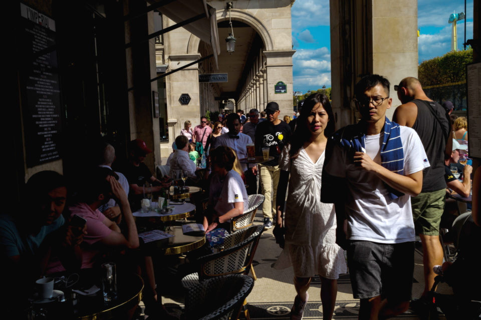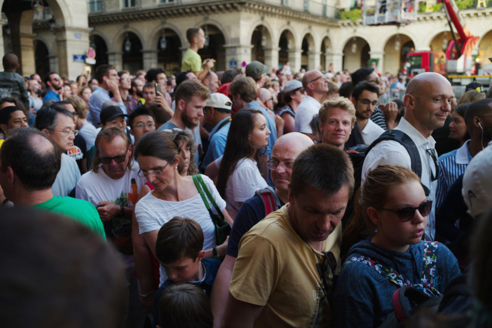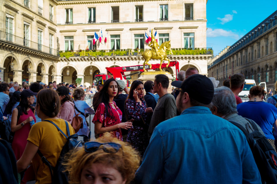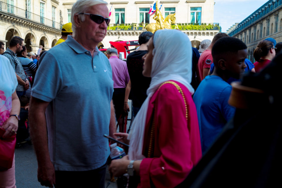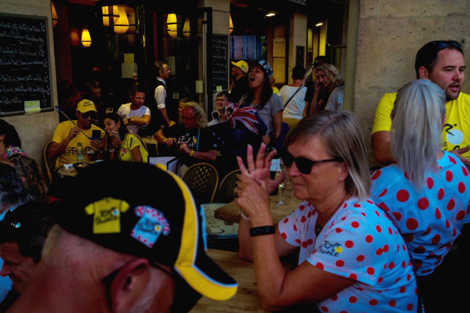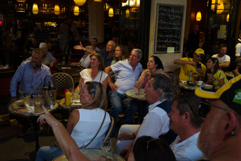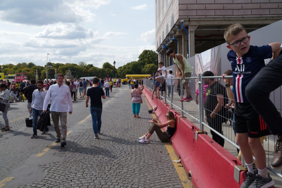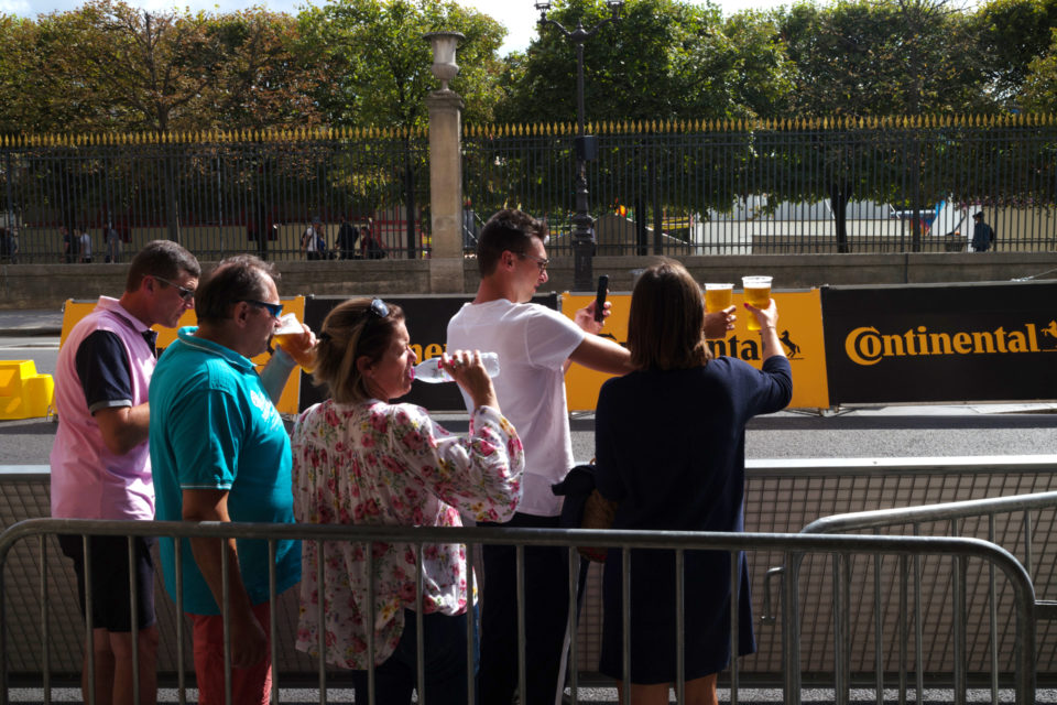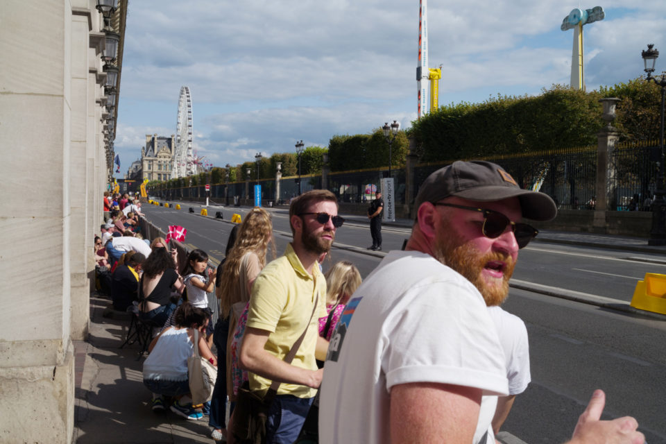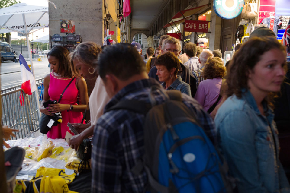 Στην τηλεόραση βλέπουμε τους ποδηλάτες, τους προπονητές, τους μάνατζερ κλπ. Αλλά ποιοι είναι οι θεατές; Σε αυτές τις φωτογραφίες ρίχνουμε μια φευγαλέα ματιά στο φίλαθλο πλήθος, αυτό που έχει μαζευτεί ακριβώς πάνω στην οδό Ρυ Ντε Ριβολί (Rue de Rivoli), δίπλα στον Λούβρο και στον κήπο Ζαρντέν Ντε Τουλερί (Jardin des Tuilleries). Είναι τόσο πολύχρωμα όλα, οι άνθρωποι οι σημαίες οι στολές, όσο θα μπορούσε και θα έπρεπε να είναι. Αν και πρόκειται για ένα ολοκληρωτικά σούπερ μάτσο αντρικό θέαμα, ανάμεσα στο πλήθος που παρακολουθεί υπάρχουν πάρα πολλές γυναίκες και παιδιά. Μετά τα Κίτρινα Γιλέκα (Gilet Jaune), είμαστε στην ευχάριστη θέση να δούμε και Κίτρινες Φανέλες (Maillot Jaune) στα Ηλύσια Πεδία.